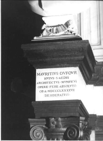 - ISCRIZIONI MAURITIUS DUFOUR/ HUIUS S AEDIS/ ARCHITECTUS MUNIFICUS/ OPERE FERE ABSOLUTO/ OB A MDCCCLXXXXVII/ DESIDERATISS - lettere capitali - a solchi - latino