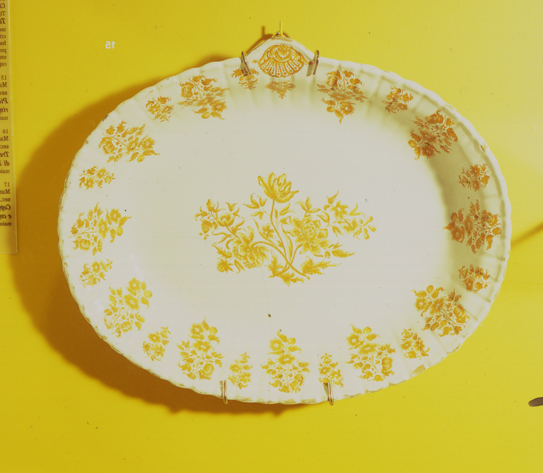 lI piatto ovale da portata ha tesa lievemente scanalata con orlo lobato con terminazione centrale a semicerchio. Al centro è dipinto un mazzo di fiori; sulla tesa, fra le scanalature, piccoli rami fioriti. Entro il semicerchio è dipinta una conchiglia. Il tutto in monocromia giallo carico