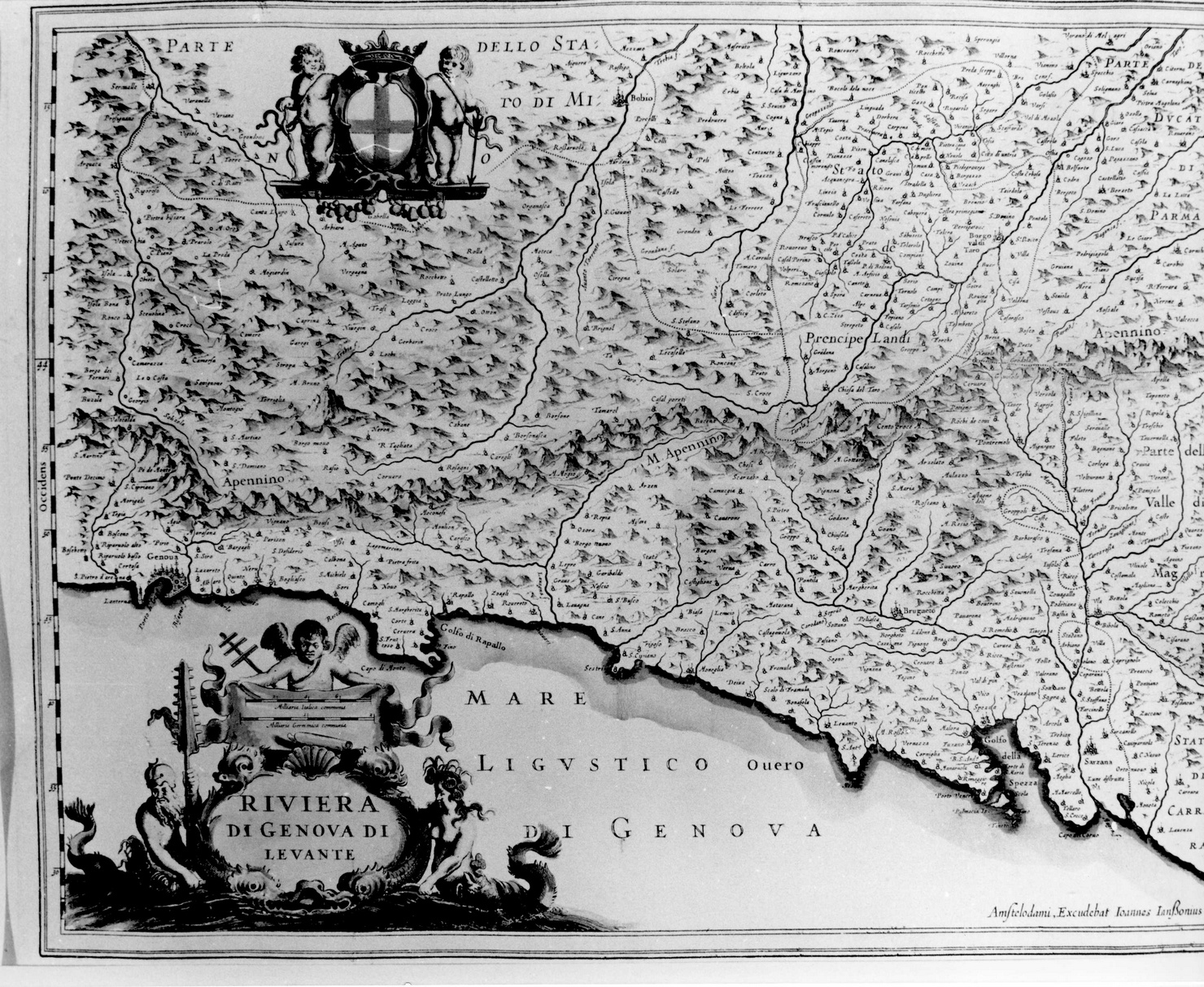 - NOTIZIE STORICO CRITICHE L'IMPOSTAZIONE DELLA CARTA E' AGGIORNATA AI DATI COROGRAFICI VISUALIZZATI DA GIO ANTONIO MAGINI NEL SUO ESEMPLARE DEL 1597 E MOSTRA UNA NOTEVOLE CURA ESECUTIVA ANCHE NEI DETTAGLI ESORNATIVI, COME I CARTIGLI CHE RACCHIUDONO L'APPARATO DIDASCALICO.LA RIVIERA DI LEVANTE, LA PARTE SUD DEL DUCATO DI MILANO, IL DUCATO DI PARMA E LO STATO DI CARRARA. CARTIGLIO CON LE INDICAZIONI DI SCALA, SORRETTO DA UN TRITONE E DA UNA NAIADE