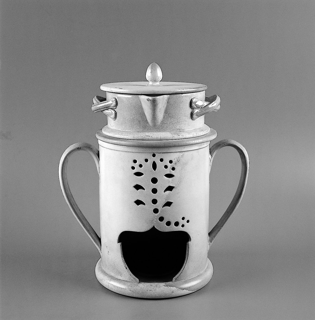 Lo scaldavivande bianco-crema si compone di quattro elementi: massiccio fusto cilindrico biansato con apertura per il godet a pagoda e fori di uscita a guisa di fiore stilizzato; bagnomaria; bassa tazza con manici a nastri intrecciati e beccuccio; coperchio piatto con presa a pomolo e godet. Terraglia Queensware