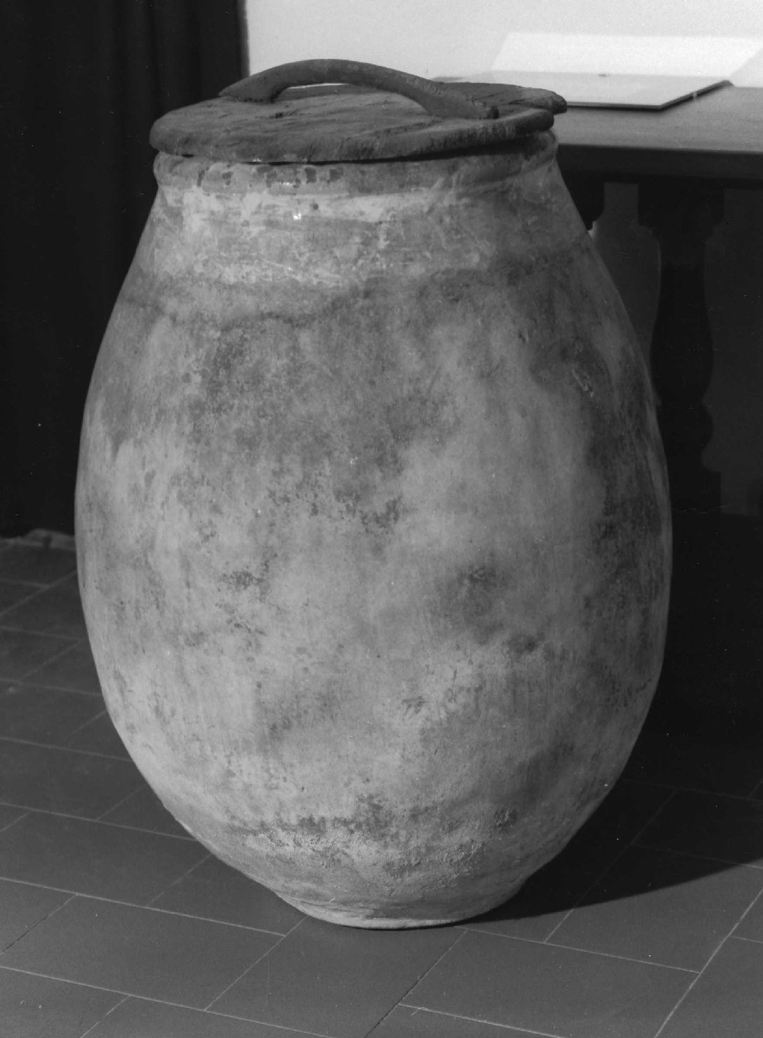 Manufatto corredato di coperchio con manico. smaltatura bianca limitata al bordo dell'oggetto