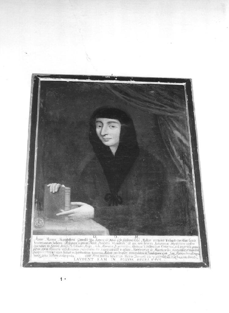 - NOTIZIE STORICO CRITICHE RITRATTO POSTUMO DELLA FONDATRICE DEL PIO ISTITUTO DELLE DAME DI MISERICORDIA. ANNA MARIA MADDALENA GRIMALDI (1748-1812). IL LIBRO CHE SOSTIENE CON LA MANO DESTRA E' UNO DEI VOLUMI DELL'OPERA DI THOMAS HEMERKEN DETTO DA KEMPIS 81380 - 1471), IL "DE IMITATIONE CHRISTI", TESTO CARDINE DELLA DEVOTIO MODERNA. L'OROLOGIO ALLUDE AL CARATTERE MODERATO DEL PERSONAGGIO. STILISTICAMENTE POVERO, IL DIPINTO RIPRENDE I MODI DEL RITRATTO DI PRIMO OTTOCENTO. IL VOLTO CARATTERIZZATO FA IPOTIZZARE UNA DATA DI ESCUZIONE CHE, SEBBENE L'ISCRIZIONE DICE POSTUMA, NON DOVREBBE SEGUIRE DI MOLTO IL DECESSO DELLA GRIMALDI