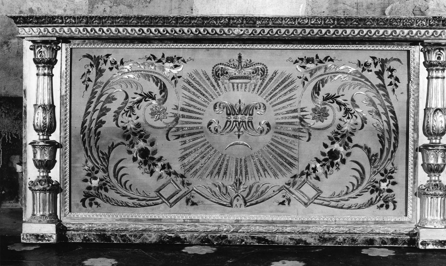 LA CORNICE CHE SIMULA UNA "CONSOLE" E' SOSTENUTA DA PILASTRINI LATERALI CON DECORAZIONI DI FOGLIE STILIZZATE BACELLATURE ED ALTRI ELEMENTI NEOCLASSICI. IL RICAMO DEL PALIOTTO ESEGUITO A PUNTO RASO IN SETE POLICROME, ORO FILATO, RICCIO E LAMELLARE , BORCHIETTE SEMISFERICHE E PAILLETTES SU ANIMA DI CARTONCINO, PRESENTA AL CENTRO , ENTRO UNA RAGGIERA IL monogramma MARIANO CORONATO POGGIante SU UNA FALCE DI LUNA . DA UNA PALMETTA AL CENTRO IN BASSO , SALE INCURVANDOSI AI LATI UNA COMPOSIZIONE CON LUNGHE FOGLIE DI PALMA E RACEMI FIORITI
