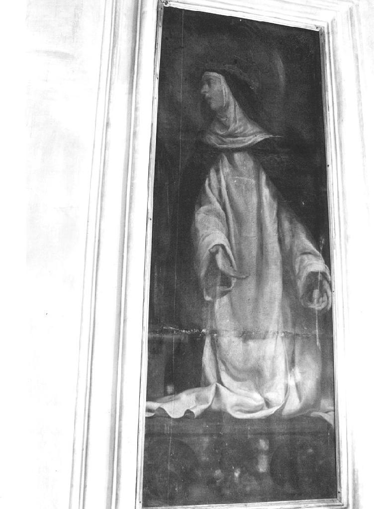 - NOTIZIE STORICO CRITICHE IL DIPINTO ATTUALMENTE INSERITO ENTRO UNA CORNICE IN STUCCO DOVEVA ESSERE PARTE DI UN'UNICA TELA CON OGNI PROBABILITà CONNESSA ALLA RAPPRESENTAZIONE DI S.DOMENICO IN PENDANT NELLA PARETE OPPOSTA.L'OPERA SI SUPPONE COLLOCATA IN ORIGINE AI LATI DELL'ALTARE DI S.M.DEL ROSARIO E SPOSTATA TRA LA FINE DELL'OTTOCENTO E L'INIZIO DEL NOVECENTO IN COINCIDENZA DELLA RISISTEMAZIONE DELLA CHIESA