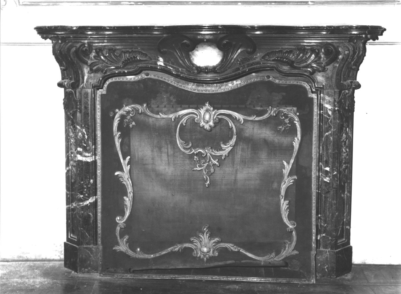 MOSTRA DI CAMINO IN MARMO NERO CON STRIATURE BIANCHE; STIPITI DECORATI NELLA META' SUPERIORE DA FOGLIE DI ACANTO E VOLUTE, RIPRESE NELLA CORNICE SAGOMATA CHE PRESENTA AL CENTRO DUE MOTIVI STILIZZATI, CHE SI PONGONO TRA LA CONCHIGLIA E LA PALMETTA. PARAFUOCO IN LEGNO SCOLPITO, INTAGLIATO E DORATO CON MOTIVI DECORATIVI APPLICATI LUNGO IL PERIMETRO A FOGLIE D'ACANTO E VOLUTE, CHE SI CHIUDONO ELLITTICAMENTE NELLA PARTE INFERIORE CENTRALE