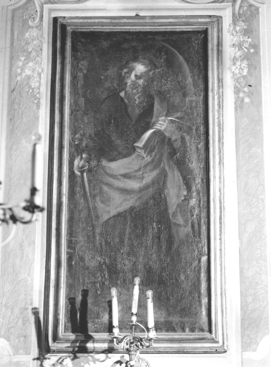 Personaggi: San paolo ; abbigliamento: veste scura/ manto rosso; oggetti: libro/ spada