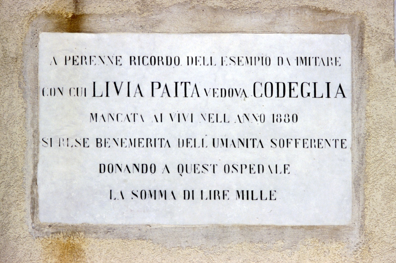 - ISCRIZIONI SULL'INTERA SUPERFICIE - A PERENNE RICORDO DELL'ESEMPIO DA IMITARE/ CON CUI LIVIA PAITA VEDOVA CODEGLIA/ MANCATA AI VIVI NELL'ANNO 1880/ SI RESE BENEMERITA DELL'UMANITA' SOFFERENTE/ DONANDO A QUEST'OSPEDALE/ LA SOMMA DI LIRE MILLE - lettere capitali - a incisione -