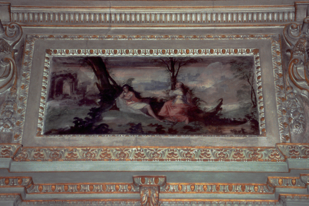 - NOTIZIE STORICO CRITICHE Nell'ottagono al centro della volta "apollo citaredo con tre muse"; nelle quattro grandi cartelle ovali laterali "muse musicanti"; sopra le porte delle testate due riquadri con, ad ovest, "una donna paludata e di schiena indica un libro aperto per terra ad un guerriero in paesaggio invernale" (l'inverno o la scelta della virtu'); ad est "una donna giovane seduta conversa con un guerriero sdraiato in paesaggio primaverile" (la primavera o la scelta del vizio).EZIA GAVAZZA PRECISA CHE LE SCELTE ICONOGRAFICHE NELLA DECORAZIONE DI QUESTO PALAZZO SONO INTERAMENTE LEGATE ALLA PRESUNZIONE DEL COMMITTENTE DI ADOMBRARSI QUALE "APOLLO IN PARNASO" (AFFRESCO DEL SALONE AL PIANTERRENO) E "APOLLO TRA FANCIULLE MUSICANTI" (ATRIO, I PIANO), PRECEDUTO DA UN CORO DI "DIVINITA'" NEI MEDAGLIONI DELL'ATRIO (1974, P. 20). QUESTE IMMAGINI "PRESENTANO...QUASI INALTERATE TINTE PREZIOSE NEI PANNEGGI GONFI E NEL MODELLATO SOLIDO DI FIGURE CHE PURE LIEVITANO IN AEREA LEGGEREZZA SULLE NUBI" (CARACENI F., 1992, P. 70). LE FIGURE DEI RIQUADRI NELLE TESTATE RISULTANO GIA' DI DIFFICILE LETTURA A ALIZERI (1847, PP. 466-467)