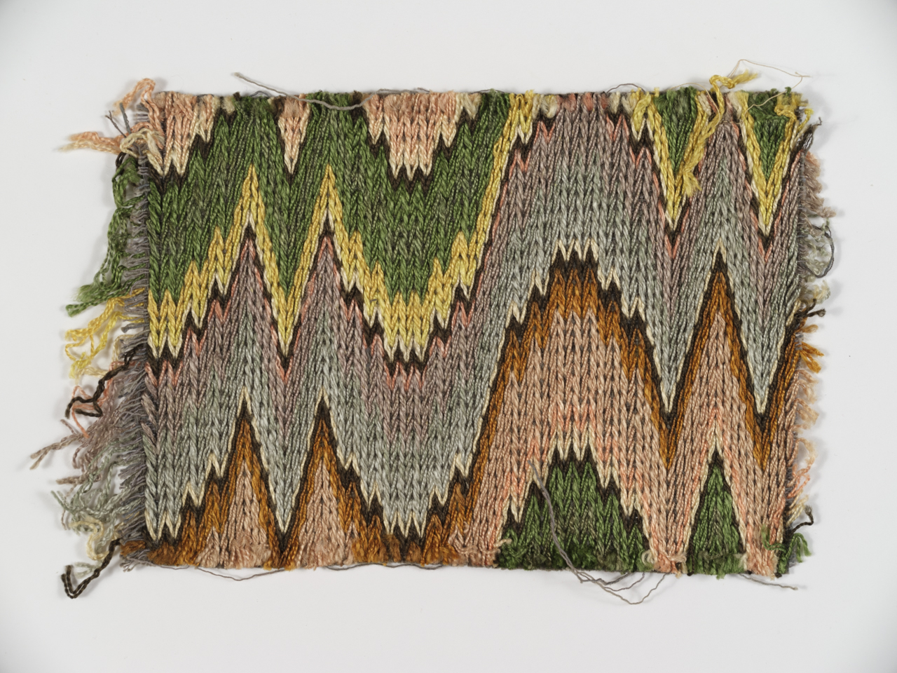 - NOTIZIE STORICO CRITICHE Il tessuto presenta un decoro a fiamma, molto usato per l’arredamento, in particolare per il rivestimento e seggiole. La tecnica di ricamo del punto fiamma o ungaro e la relativa decorazione sono in uso dalla seconda metà del XVII secolo fino al principio del Novecento. Nel corso del XIX secolo si ha un revival di tale soluzione, in particolare per tessuti di arredo realizzati con materiali robusti anche in ambito casalingo. Il frammento sembra essere attribuibile a questa fase della fortuna del motivo. Il pezzo proviene dalla antica raccolta Bruzzo, ma il vecchio numero di inventario è assente