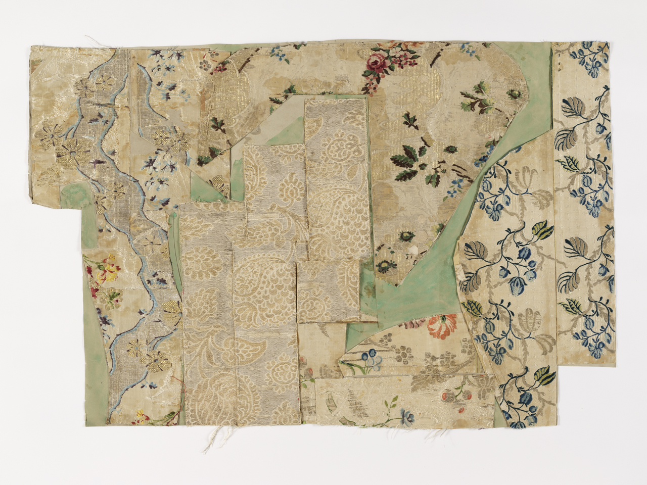 Tessuto frammentario in taffetas broccato incollato su cartoncino acquerellato verde. Fondo in taffetas prodotto da ordito e trama di fondo in seta bianca, con motivi di controfondo dati da slegature della trama, ricoperto da trame lanciate in argento lamellare; opera per effetto di trame broccate in seta policroma, oro lamellare, oro filato, oro riccio. Motivo decorativo a meandro definito da nastri che si snodano sinuosi in verticale, di cui uno smerlato tracciato sul fondo del tessuto e uno dorato dai margini sagomati solcato da piccole corolle, dal quale si dipartono rami fioriti. Disegno policromo su fondo bianco