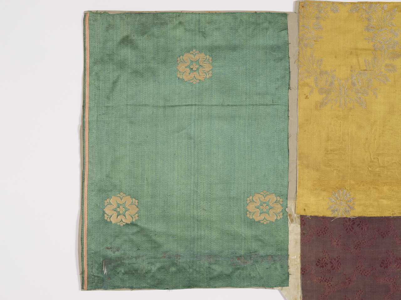 Telo in raso generato da ordito e trama di fondo in seta verde; decoro a teorie orizzontali sfalsate di rosette descritte da una trama broccata in seta bianca. Cimosa in seta bianca e rossa di cm 0.8