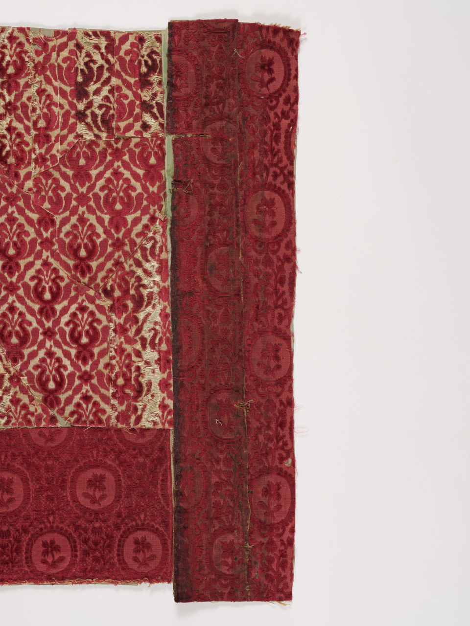 Tessuto composto da due frammenti in velluto cesellato a un corpo a sviluppo longitudinale assemblati su cartoncino. Fondo in raso creato da ordito e trama di fondo in seta rossa; disegno descritto in velluto tagliato e velluto riccio da un ordito di pelo in seta rossa. Motivo decorativo a scacchiera di scomparti ovali profilati da una cornice a perlato e inglobanti fiorellini su steli, il cui orientamento è alternato in verticale; tra un ovale e l'altro si diramano ramoscelli con foglie e fiori
