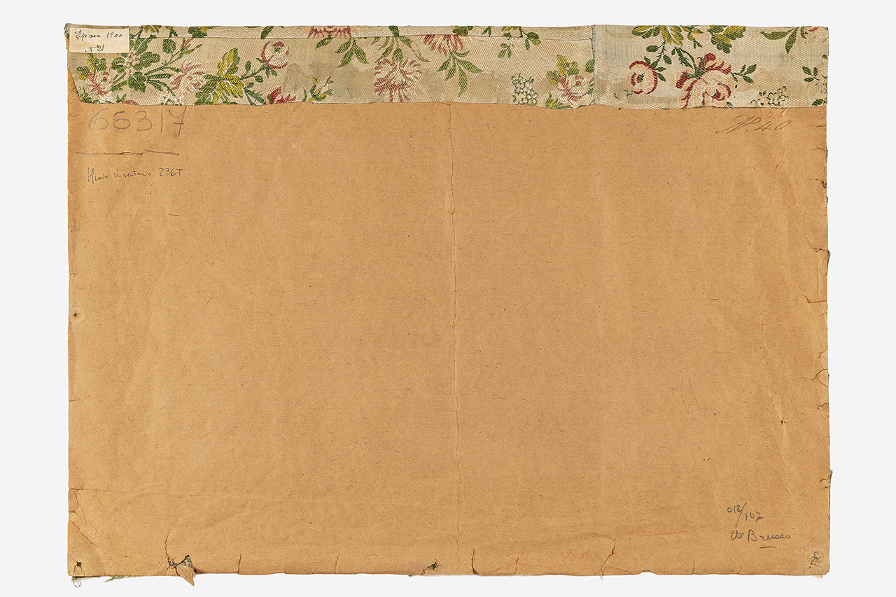Tessuto composto da due frammenti in cannetillé operato assemblati su supporto in cartoncino. Cannetillé prodotto da ordito e trama in seta avorio; disegno descritto da una trama lanciata in seta verde, da trame broccate in seta rosa e verde in più gradazioni e da slegature di un ordito di pelo in seta bianca. Grandi ramages di rose e fiori a grappolo formano due linee sinuose verticali e speculari nell'altezza del tessuto. Nelle anse laterali fiori e frutti simili a melograni; al centro mazzi di tre garofani rosa sormontati da campanule bianche. I rami e parte delle foglie sono dati da una trama lanciata in seta verde. I petali dei fiori e particolari delle foglie sono dati da trame broccate in sete policrome. Tutte le trame supplementari sono legate sul dritto del tessuto in diagonale, con fili prelevati dall'ordito di fondo. Sul rovescio le trame lanciate sono legate in taffetas, mentre le trame broccate restano slegate. In corrispondenza del frammento maggiore è visibile l'impronta di una croce di Malta, in origine applicata sul tessuto. Cimosa in seta bianca e verde di cm 0.6