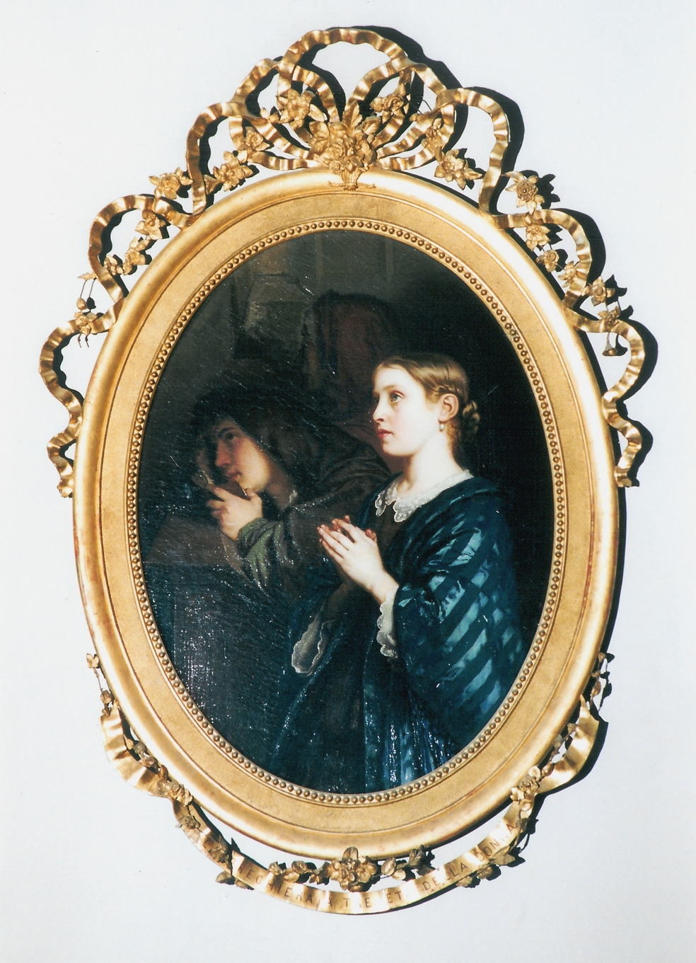 - NOTIZIE STORICO CRITICHE TELA OVALE CON CORNICE IN LEGNO SCOLPITO, INTAGLIATO E DORATO CON CARTIGLIO IN LAMINA METALLICA DORATA APPLICATA E DECORATA DA ROSETTE NELLA PARTE SUPERIORE E INFERIORE.SOGGETTO RETORICO, EXEMPLUM RELIGIOSO INDIRIZZATO ALLE DONNE E, SOPRATTUTTO, ALLE RAGAZZE, COME LASCIA INTENDERE LA PRIORITA' VISIVA CONFERITA ALLA FANCIULLA CON LE MANI GIUNTE IN PRIMO PIANO. L'IGNOTO ARTISTA AUTORE DEL QUADRO POTREBBE APPARTENERE ALLA SCUOLA DI FRASCHERI, MA ANCHE ALL'AMBIENTE TOSCANO