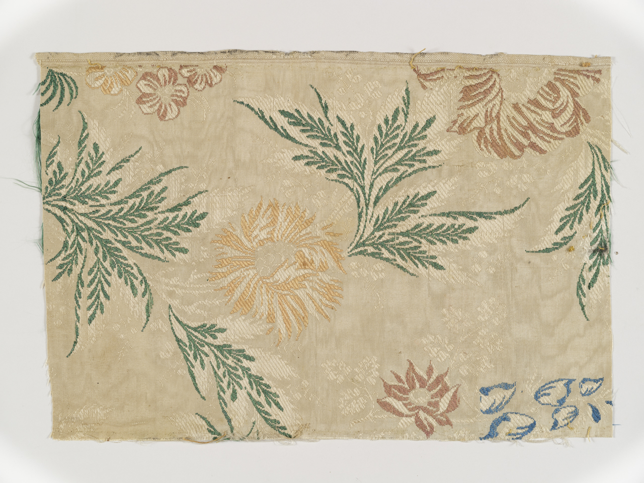 - NOTIZIE STORICO CRITICHE Il manufatto rientra nelle produzioni di tessuti operati francesi e italiani della prima metà e degli anni centrali del XVIII secolo, caratterizzati dalla moltiplicazione degli effetti decorativi nell’intreccio e da motivi vegetali lussureggianti e di gusto esotico su fondi a tinte chiare. Si vedano ad esempio alcuni frammenti della raccolta Gandini di Modena (cfr. Devoti D./ Guandalini G./ Bazzani E./ Cuoghi Costantini M./ Silvestri I. 1985, pp. 186-192, nn. 96-105)