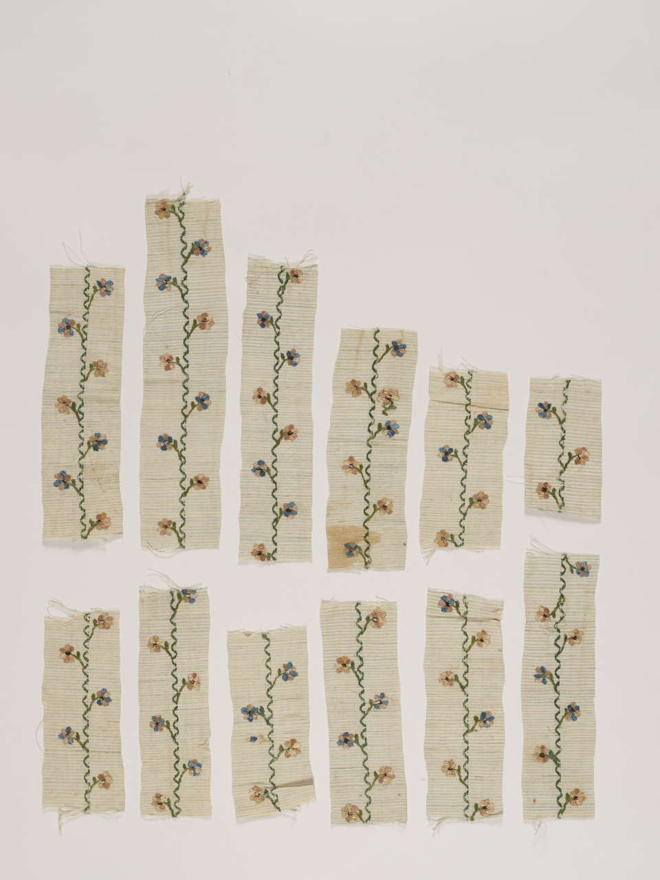 Frammenti di tela a righe orizzontali per trame in cotone bianche varianti e celesti con orditi in seta avorio e a pelo strisciante (ordito di pelo in seta verde), ricamata a punto raso e spaccato in seta verde, marrone, rosa e celeste. Su un fondo a righe orizzontali celesti e bianche corre un tralcio verde a zig zag stilizzato da cui sbocciano, alternativamente da una parte e dall’altra del tralcio, fiorellini con petali o tutti rosa o rosa e azzurri. I fiorellini sono ricamati, il tralcio centrale è per opera tessuta, le righe sono prodotte per effetto delle trame varianti