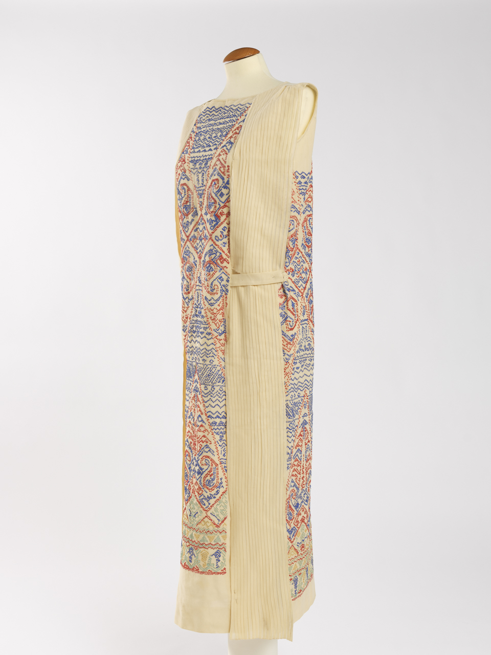 Abito in crepe de chine crema con ricami in paillettes di vetro rosse, bluette e nella parte inferiore verdi e ocra. Abito a tunica dal taglio dritto e senza maniche con scollo a barca. Sul davanti corre una decorazione continua (dal petto a 6 cm dall’orlo inferiore) con ricamo in paillettes. Le paillettes creano motivi geometrici (triangoli, losanghe, linee spezzate etc.) e motivi vegetali stilizzati lontanamente ispirati ai decori cachemire (goccia boteh). Sul retro, dalle spalle all’orlo, corrono due fasce verticali plissettate dello stesso tessuto della veste (l. 13). All’altezza dei fianchi le bande passano sotto una sorta di fettuccia orizzontale (h. 3) in crepe de chine. Nel pannello centrale corre continua la stessa decorazione ricamata del davanti in pailletes policrome fino a 14 cm dall’orlo inferiore