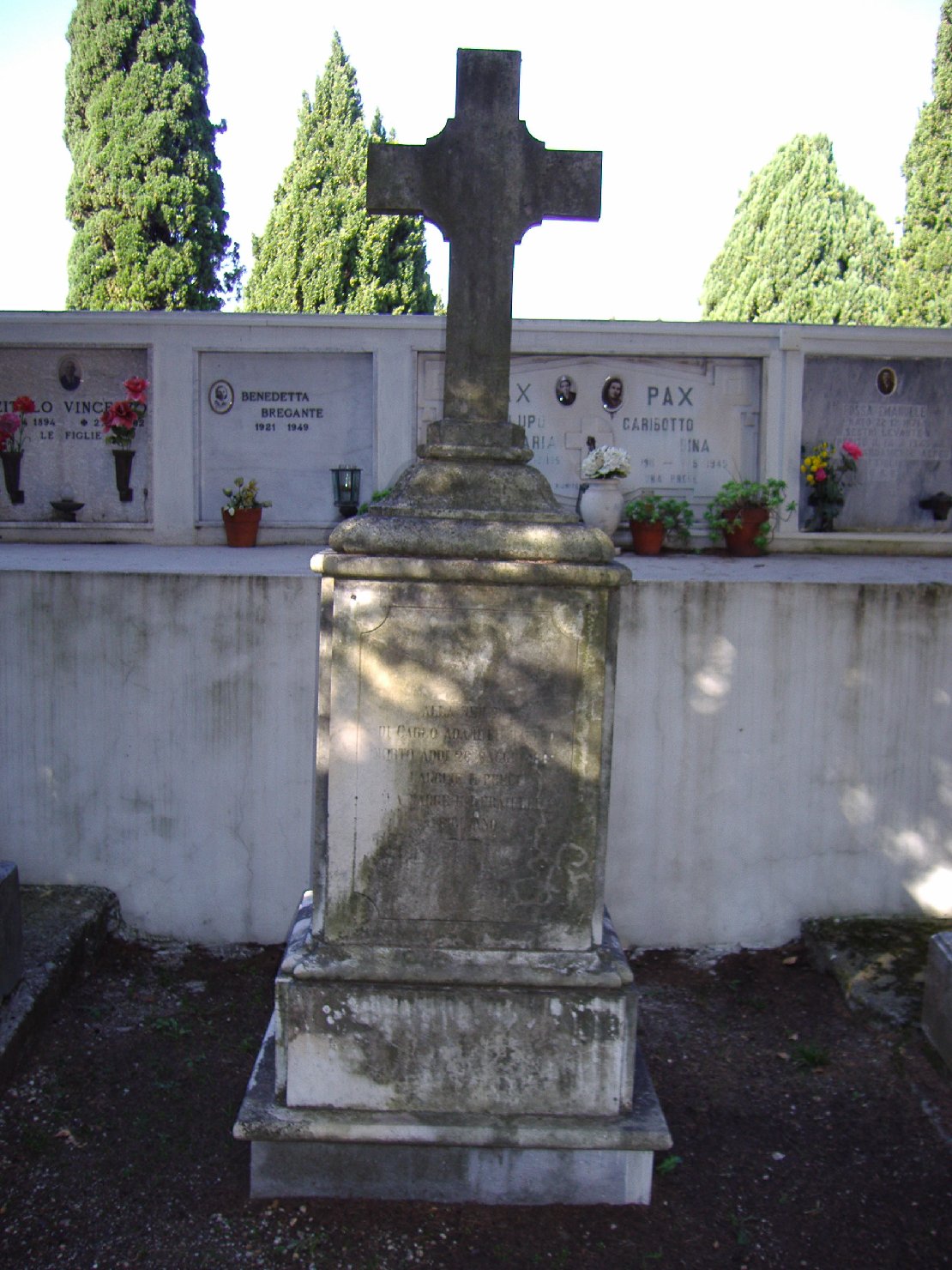 - NOTIZIE STORICO CRITICHE In una petizione alla giunta provinciale dell'11 agosto 1924 la popolazione di Sestri Levante chiede di negare la traslazione dell'intero cimitero (ubicato anticamente presso la chiesa di San Nicolò sulla penisola di Sestri) con le sue salme, lamentando l'illecita cessione di un bene ecclesiastico e non comunale da parte del Comune all'avvocato Riccardo Gualino. L'Avvocato desidera infatti acquistare i terreni su cui giace il cimitero per tagliare una strada e costruire alcune ville. La petizione non viene accolta e, tra il 1924 e il 1927, il cimitero viene spostato nel luogo in cui all'oggi si trova, in regione Val di Canepa.Il monumento è in stile classico, scevro di qualsiasi orpello e dalle linee essenziali