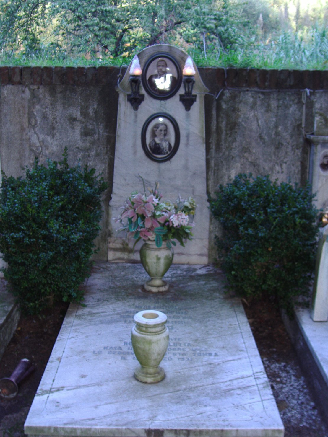 Monumento a terra con lastra tombale e lapide centinata con cornice incisa a bassorilievo e all'interno 2 foto in ovale dei defunti. In basso motivi vegetali incisi. La lastra tombale è incorniciata da rilievo e reca un'iscrizione