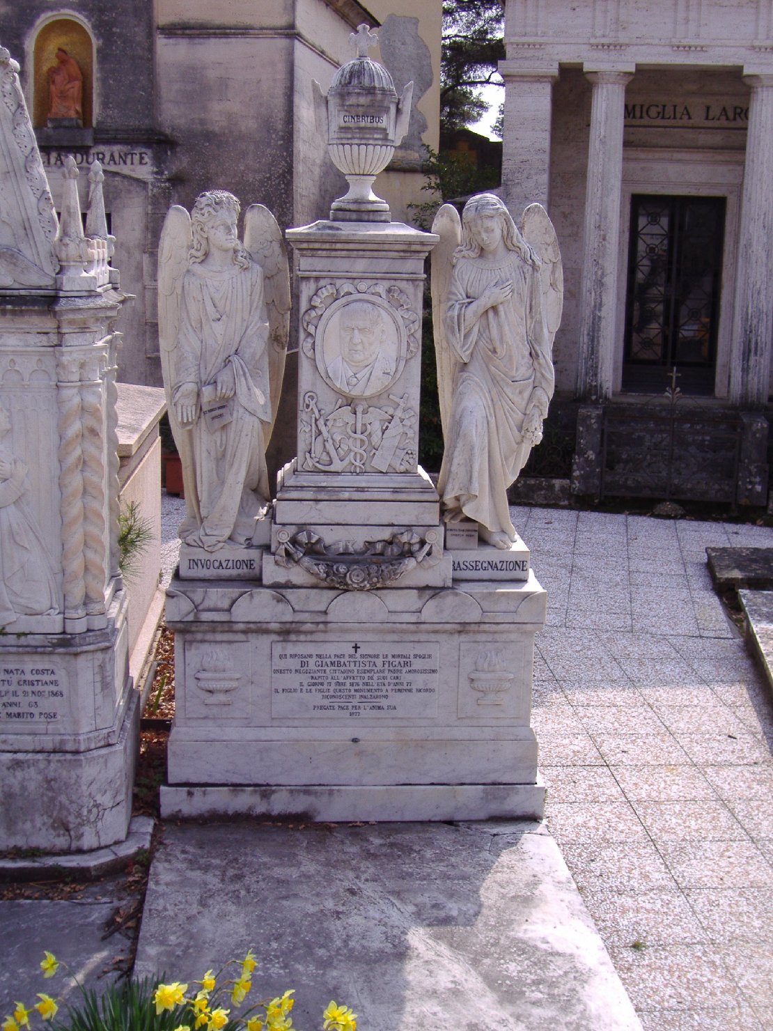 - ISCRIZIONI Sul fronte del basamento - Qui riposano nella pace del Signore le mortali spoglie/ di Giambattista Figari/ onesto negoziante cittadino esemplare padre amorosissimo/ rapito all'affetto dè suoi cari/ il giorno 17 9(vem)bre nell'età d'anni 77/ il figlio e le figlie questo monumento a perenne ricordo/ riconoscenti innalzarono.Pregate pace per l'anima sua/ 1877 - lettere capitali - a solchi -