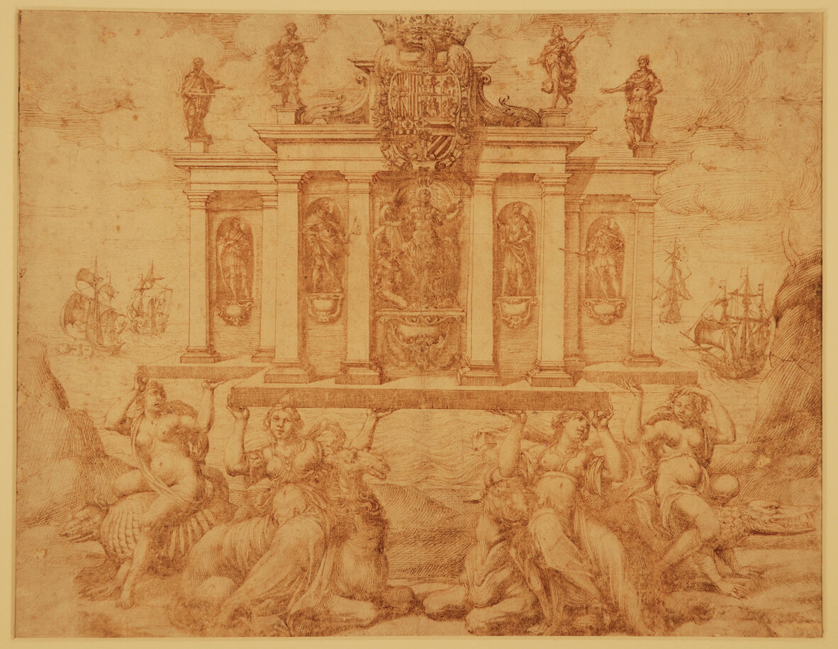 Disegno rettangolare su carta bianca con rappresentazione allegorica della Monarchia spagnola, il cui edificio è retto dai quattro continenti ritratti in forma femminile, riconoscibili dagli animali che le accompagnano