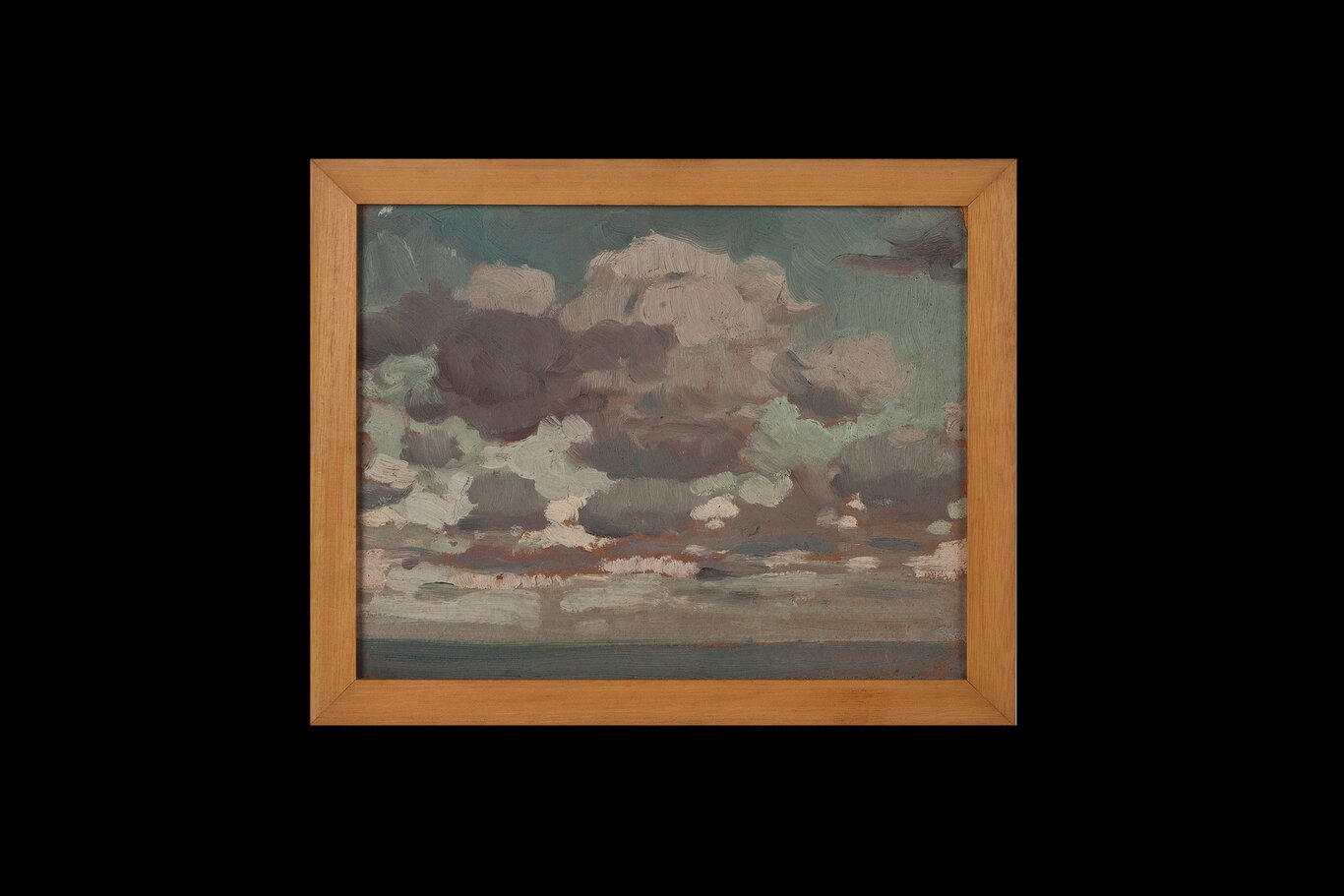 Dipinto su cartone raffigurante un banco di nubi grigio rosate