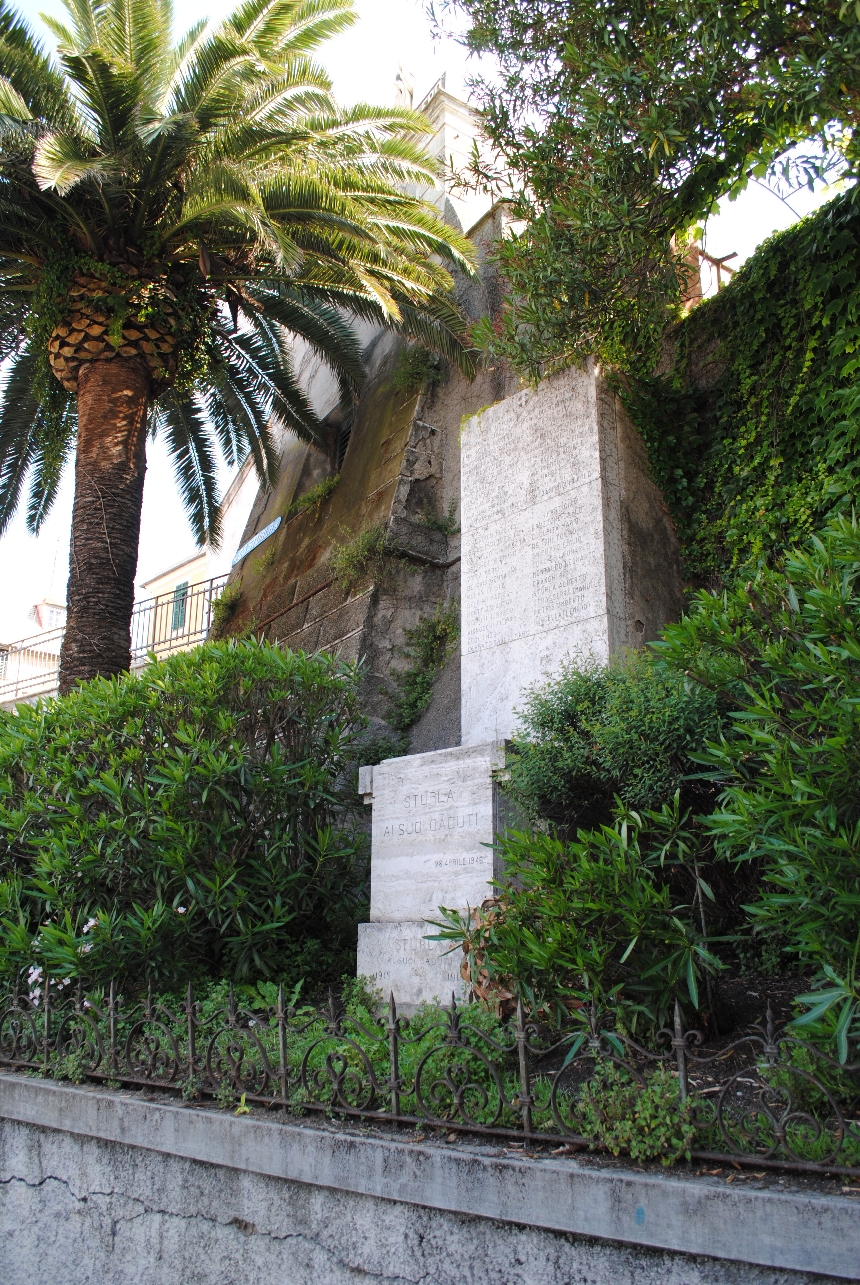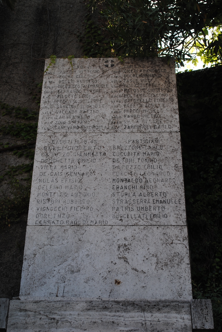 - NOTIZIE STORICO CRITICHE Il monumento, opera dello scultore Luigi Orengo, fu inaugurato il 20 settembre 1924. Come si evince dalle foto d'epoca, originariamente sul cippo era posta una statua di bronzo, raffigurante un fante in divisa con fucile in mano e, al disotto, una lapide con elenco dei caduti. Durante il secondo conflitto mondiale La statua fu rimossa e fusa per farne armi. Fonte bibliografica: Rossini Giorgio (a cura di), “Da Baroni a Piacentini. Immagine e memoria della Grande Guerra a Genova e in Liguria”, Skira editore, Milano 2009, pp. 144 fig. 3; 153. Sitografia: http://www.monumentigrandeguerra.it (id immagine: 2641)