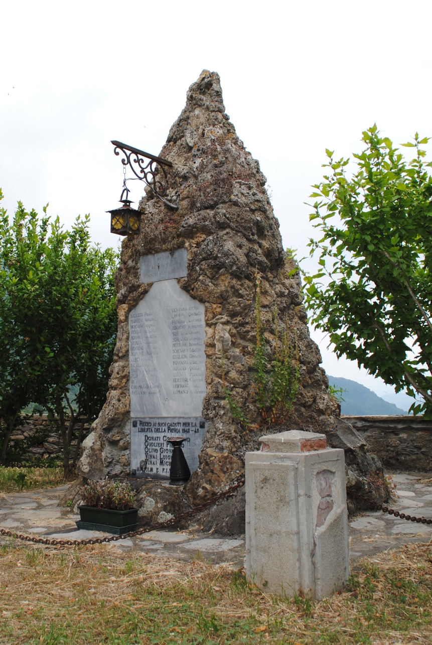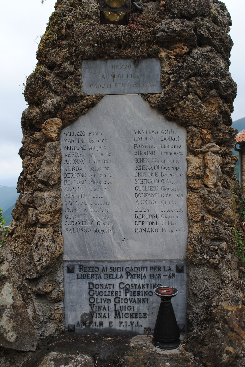 Il monumento ai caduti di Rezzo (IM) è sito nella piazza di fronte al castello su un’area lastricata (400x400cm circa) delimitata da una catena sorretta agli angoli da quattro pilastrini. Si configura come un ammasso informe di pietre e cemento che ricorda una roccia alpina; sul fronte sono collocate due lapidi di marmo con incisi la dedica e i nomi delle vittime della prima guerra, cui se ne aggiunta una terza con l’elenco dei caduti nel 1945. Non ci sono elementi decorativi se non una lanterna in ferro posta al di sopra delle lapidi