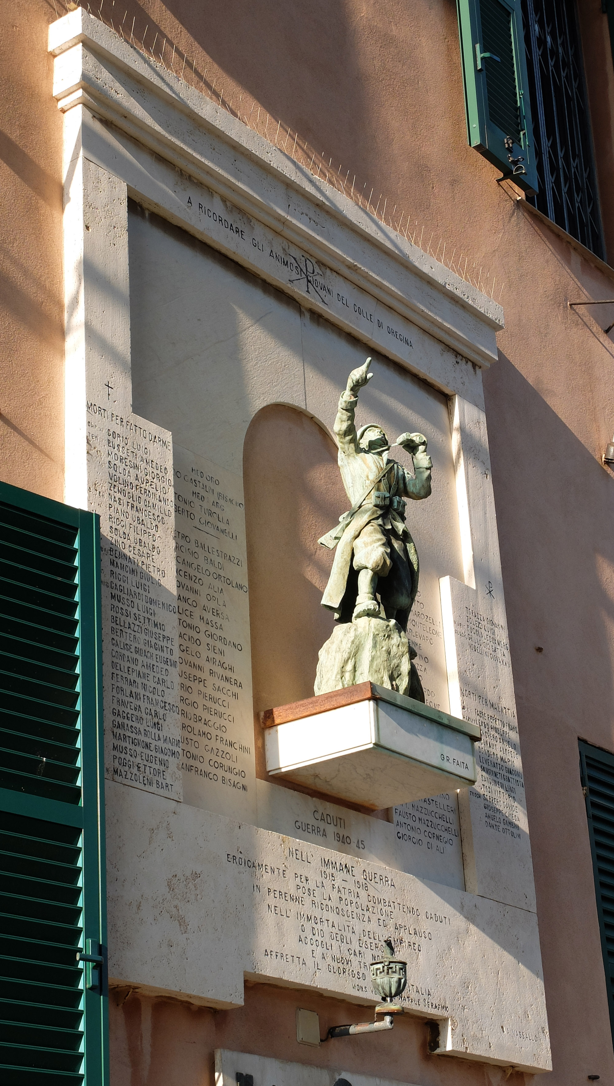 Il monumento a lapide di Oregina presenta al centro una lunetta entro al quale, su un basamento aggettante, poggia una scultura in bronzo raffigurante in maniera realistica un soldato. La figura maschile in uniforme è posta su un cippo, indossa un elmetto e a tracolla ha un fucile a baionetta ed è raffigurato mentre con la mano sinistra tiene dei binocoli e con quella destra sembra indicare qualcosa