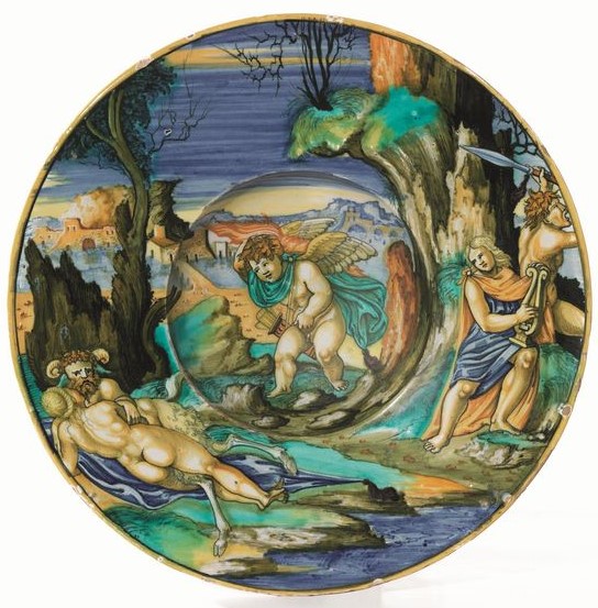 - NOTIZIE STORICO CRITICHE La scena è racchiusa tra un vecchio albero spoglio e disadorno e una rupe alta, coperta da zolle erbose; sullo sfondo, un paesaggio fluviale con alte colline squadrate e un borgo con un ponte su un fiume. Lo scenario è abitato da tre gruppi di figure: al centro, Eros avanza portando sulle spalle una saetta, a destra, seduto su una roccia, è raffigurato Apollo; a sinistra è collocata una scena erotica tra un satiro e una ninfa. Il manufatto, di alta qualità esecutiva, rientra appieno nella vasta produzione che fa capo a Francesco Xanto Avelli, prolifico pittore di maioliche attivo nel Ducato di Urbino durante il governo di Francesco Maria della Rovere. Il soggetto, tratto dalle Metamorfosi di Ovidio, si dispiega su tutta la superficie del piatto tramite un'attenta e studiata scansione narrativa, l'ambientazione paesistica e le figure che vi agiscono sono saldamente definite dal disegno, la policromia, satura e intensa, percorre la consueta tavolozza prediletta dalle manifatture urbinati nel primo Cinquecento: blu, giallo, arancio, verde rame, verde giallastro, nero. Sul retro, come di consueto, un verso dell'artista enuncia il tema svolto