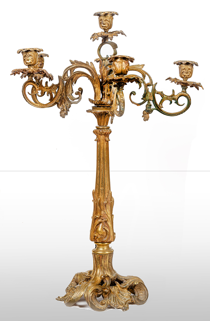 Candelabro in bronzo dorato. Base a tripode con volute e foglie, fusto scanalato con foglie ascendenti tipo fiamma. Sei bracci, di cui uno centrale, a racemi torti di foglie d'acanto, coppette reggicandela e coglicera formati da fogliette inanellate
