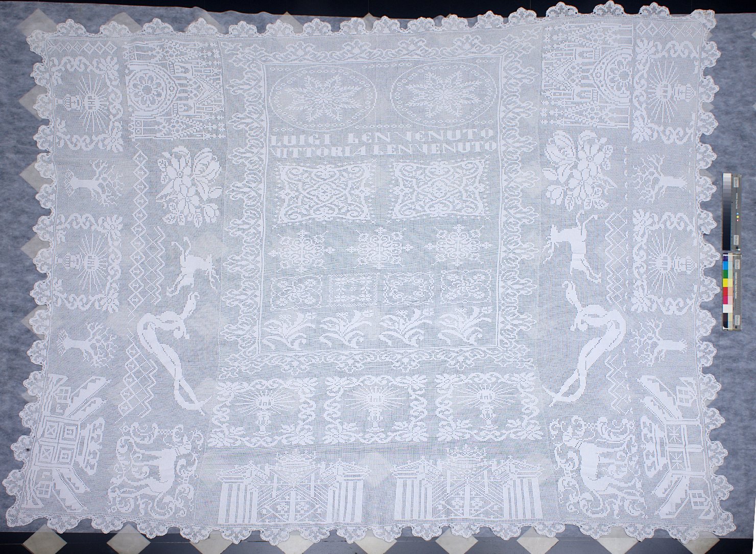 - NOTIZIE STORICO CRITICHE Copriletto parte di un corredo nuziale di manifattura ligure-genovese, databile attorno al 1860-1880. Fu realizzato per il matrimonio di Luigi Benvenuto e della sposa Vittoria, "esponenti di una famiglia della media borghesia genovese" (Fiore 2022, p. 441)