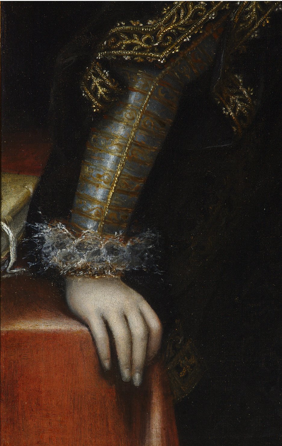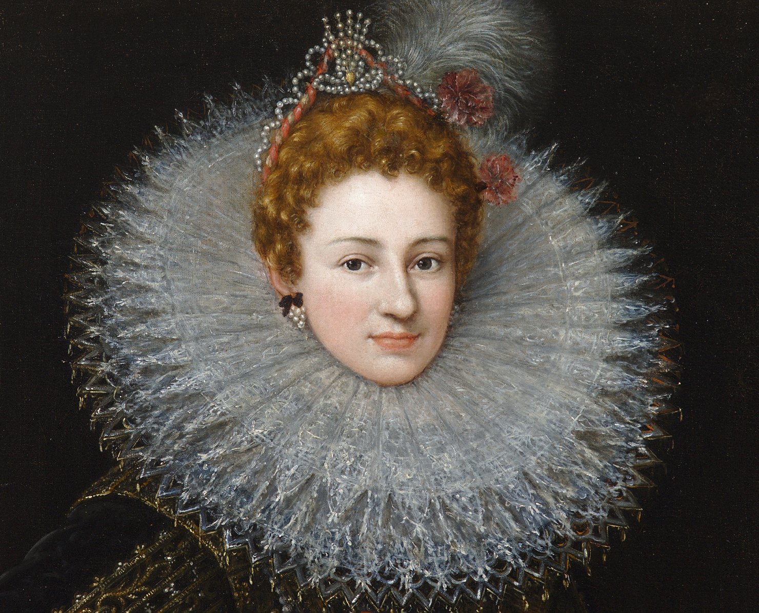 Giovane dama ritratta a tre quarti in abito scuro con ricami in oro, collare in pizzo, collana di perle al collo. Tra i capelli, nastri, perle, due fiori rossi ed una piuma bianca; gli orecchini ai lobi, a forma di grappolo, sono di perle. Poggia la mano destra sullo spigolo di un tavolo