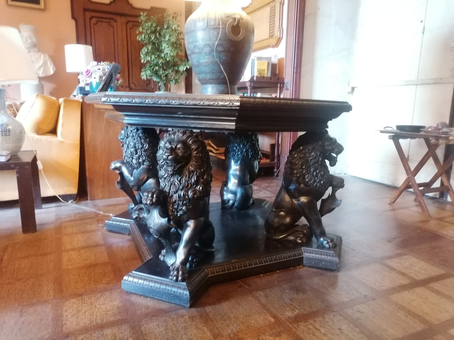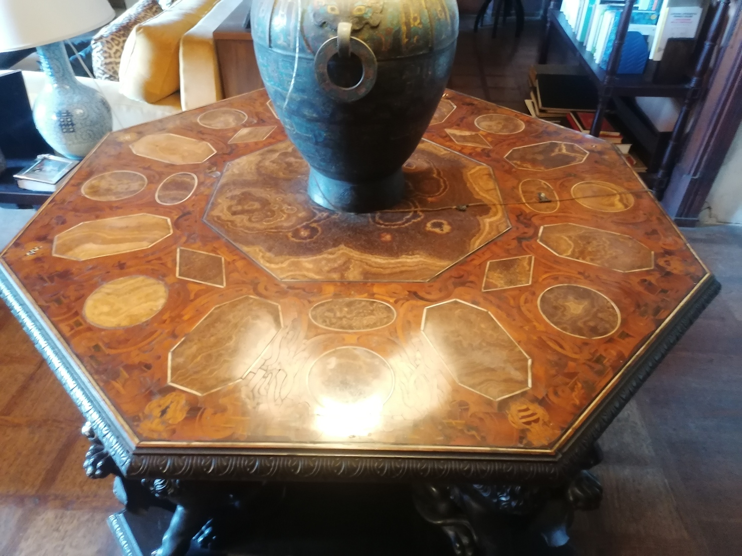 Tavolo con mensa ottagonale, realizzata a intarsio e commessa in pietre dure con otto stemmi patrizi e decori, il tutto incorniciato da una cornice intagliata e modanata. Il piano è sorretto da quattro leoni su base sagomata con zampa rampante e nell'altra una targa con stemma sormontato da corona