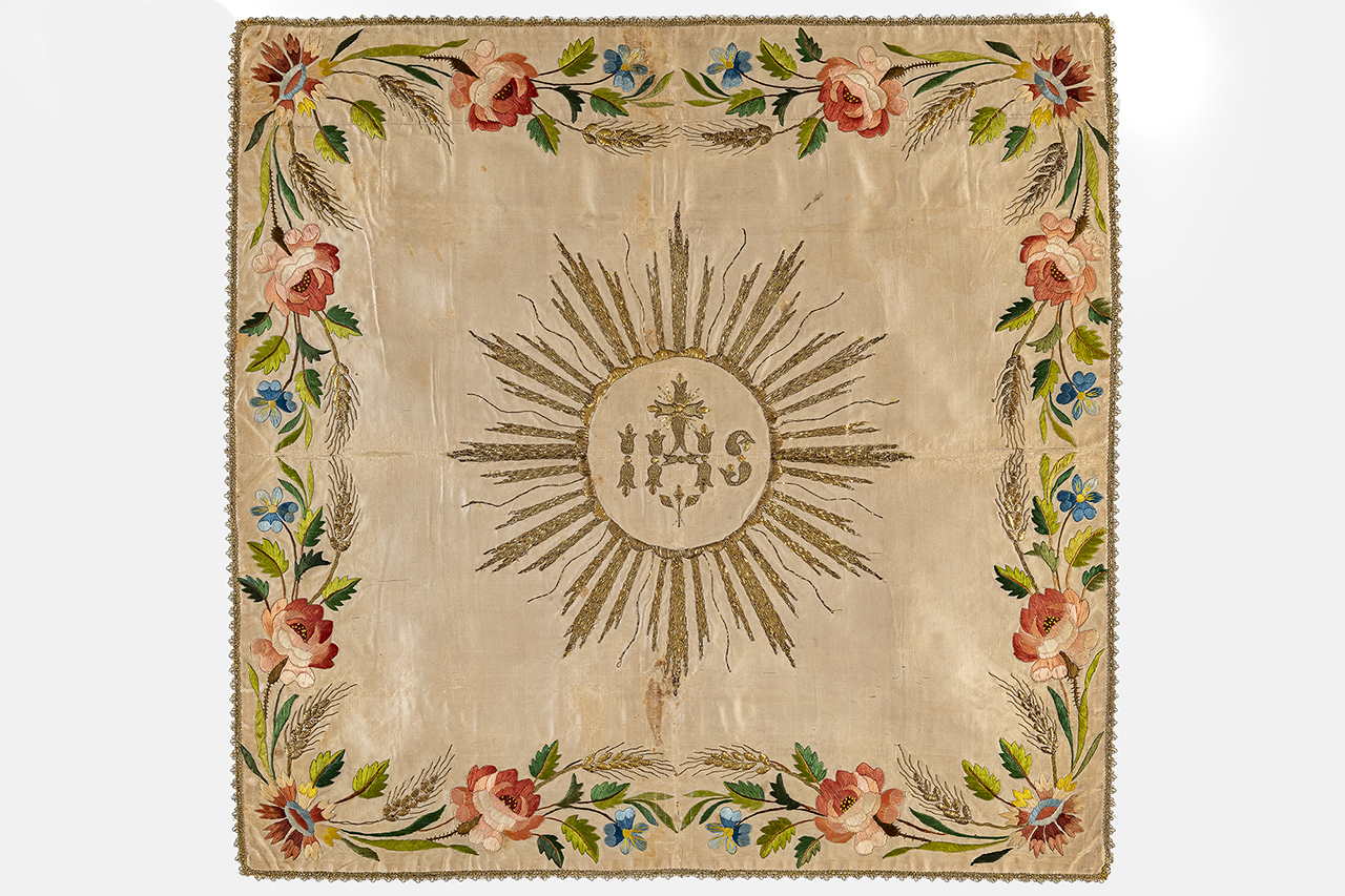 Velo di calice in raso prodotto da ordito e trama di fondo in seta bianca; motivo decorativo eseguito a ricamo in sete policrome (giallo, marrone, viola, verde, rosa, azzurro in più gradazioni) a punto pittura, punto nodini, in argento filato dorato e in argento lamellare dorato con imbottitura. Lungo i margini si affrontano rami fioriti lievemente ondulanti con rose, fiori e spighe di grano, aventi origine da corolle disposte in corrispondenza degli angoli velo; al centro è ricamato il monogramma IHS entro un tondo dai margini smerlati da cui si dipartono raggi fiammeggianti e lanceolati. Fodera in taffetas di seta ceruleo. Gallone perimetrale a puntine in seta gialla e metallo filato e lamellare dorato