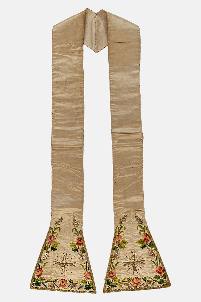 Stola in raso prodotto da ordito e trama di fondo in seta bianca; motivo decorativo eseguito a ricamo in sete policrome (giallo, marrone, verde, rosa in più gradazioni) a punto pittura, punto nodini, in argento filato dorato e in argento lamellare dorato con imbottitura. Sui margini delle alette sono disposti rami fioriti lievemente ondulanti con rose e spighe di grano; al centro del troncone e delle alette sono ricamate croci raggiate con terminazioni dei bracci biforcate. Fodera in tela di lino rosa. Gallone perimetrale delle alette a puntine di cm 0.5 in seta gialla e metallo filato e lamellare dorato