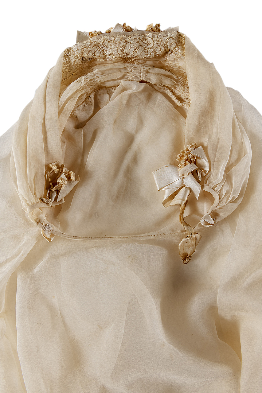 Velo in organza con cuffia ricamata a punto smock e ornata da cinque fiocchi in raso bianco su cui sono applicati mazzolini di fiori in tessuto; allacciatura sotto al mento tramite nastrino in raso con asola e bottone in madreperla