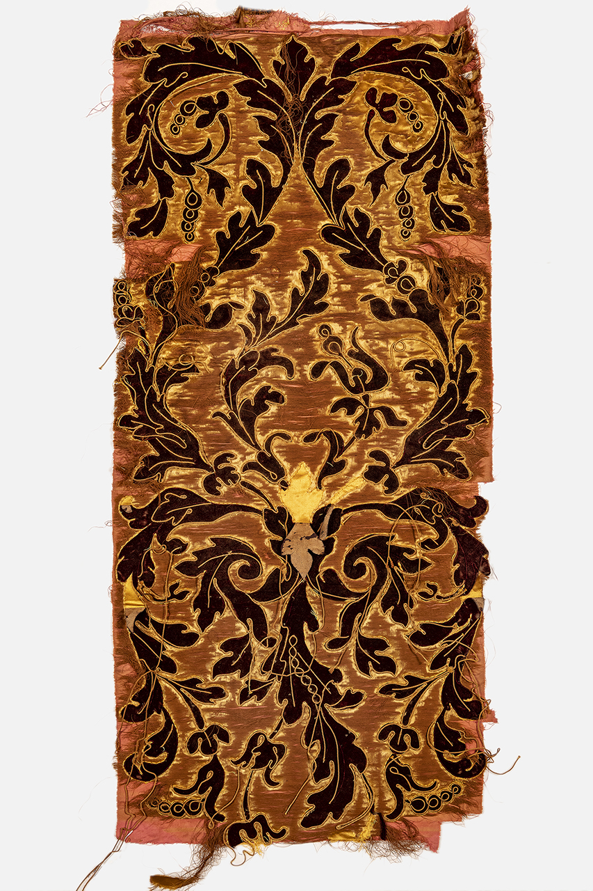 Pannello in raso giallo oro da 8 faccia ordito (ordito giallo, trama ocra) ricamato ad applicazione con riporti in velluto di seta cremisi unito tagliato, profilato da due diversi cordonetti in seta gialla. Fodera in tela di lino rosa. Le applicazioni creano un decoro vegetale con grandi racemi a voluta, inflorescenze frastagliate e foglie stilizzate