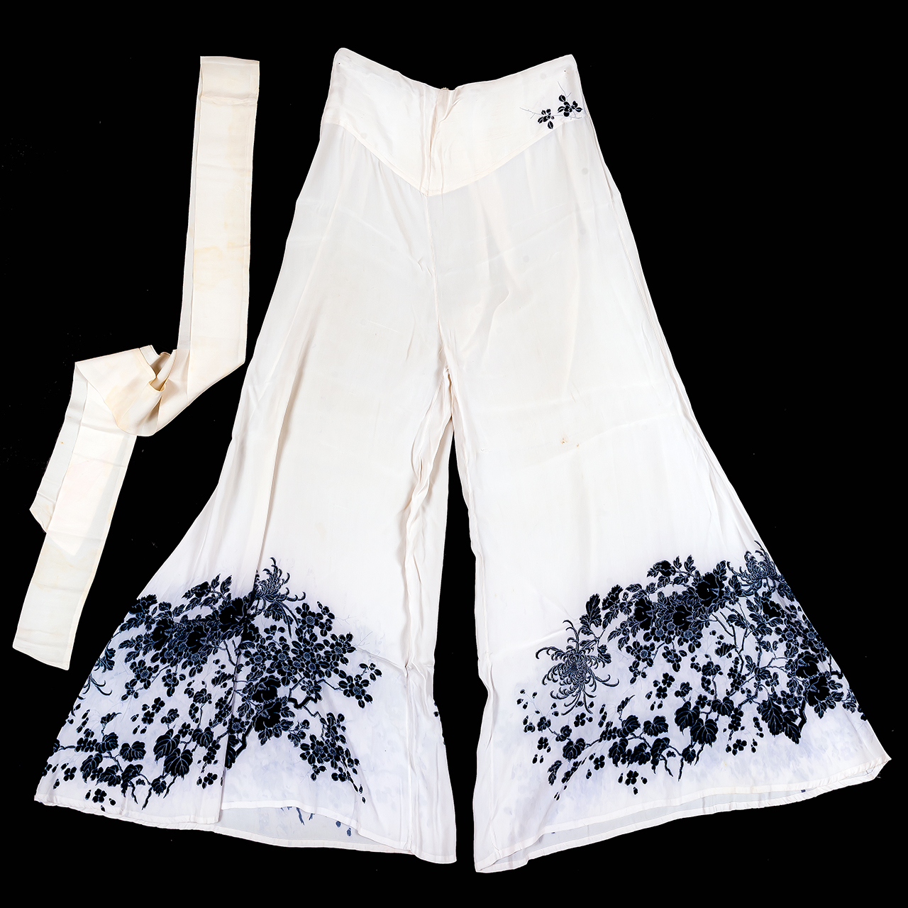 Pigiama palazzo in taffetas di seta o viscosa bianca, stampato blu notte a motivi floreali, in tre pezzi: casacca senza maniche con scollo a V, pantalone palazzo (con chiusura sul fianco sinistro tramite bottone automatico ed elastico arricciato sul retro della vita) e fascia-cintura liscia priva di decorazione. La decorazione stampata in blu scuro e carta da zucchero a rami di peonia recisi, rami di ciliegio fioriti e altri fiori orientaleggianti su steli corre nella parte inferiore della casacca e sulla parte bassa delle gambe dei pantaloni. Sui pantaloni un piccolo motivo a ramo fiorito con boccioli appare anche nella parte anteriore della cintura sul fianco sinistro