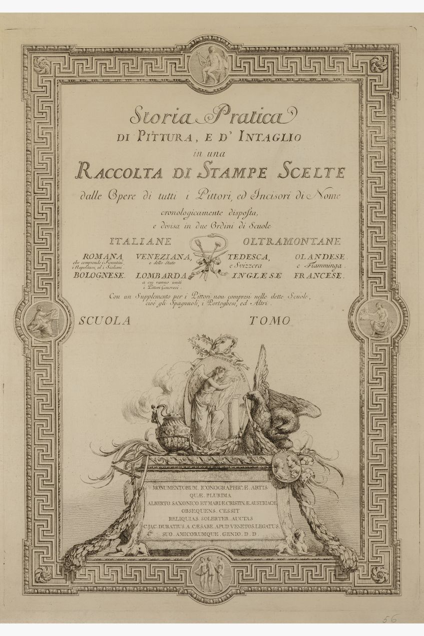 - ISCRIZIONI Entro la cornice: in alto - Storia Pratica/DI PITTURA, E D'INTAGLIO/in una/RACCOLTA DI STAMPE SCELTE/dalle Opere di tutti i Pittori, ed Incisori di Nome/cronologicamente disposta/e divisa in due Ordini di Scuole - capitale -