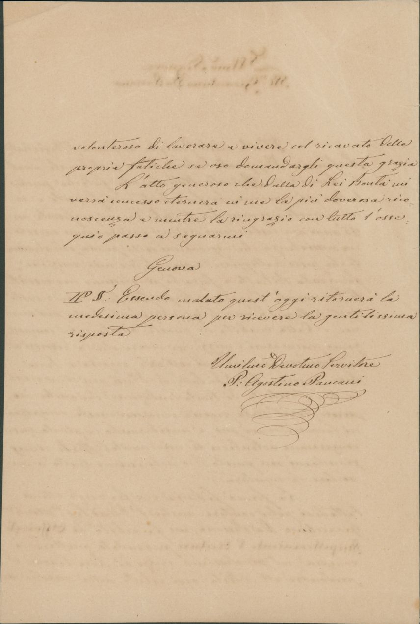 - NOTIZIE STORICO CRITICHE Il disegno di Agostino Pancani, costituito da fitte iscrizioni che, attraverso l’intreccio grafico delle parole, delineano il busto di Cristoforo Colombo, rappresenta un singolare esempio di scrittura figurata ottocentesca. Le frasi che compongono la sagoma del navigatore ripercorrono la sua vicenda biografica, restituendone l’immagine attraverso il testo stesso: una traduzione visiva della parola che Pancani definisce, nella lettera di accompagnamento, come "lavori delle pazienti ottiche mie fatiche". Il foglio è infatti corredato da una lettera autografa dell’autore (inv. PAL-GE.INV. 5566), indirizzata al marchese Gioacchino da Passano (1806–1895), nella quale l’artista presenta e offre il disegno in cambio di un modesto compenso. Il contenuto della lettera e le informazioni biografiche relative al destinatario consentono di collocare cronologicamente il disegno nell’ambito della seconda metà del XIX secolo, in coerenza con le sue caratteristiche stilistiche e calligrafiche