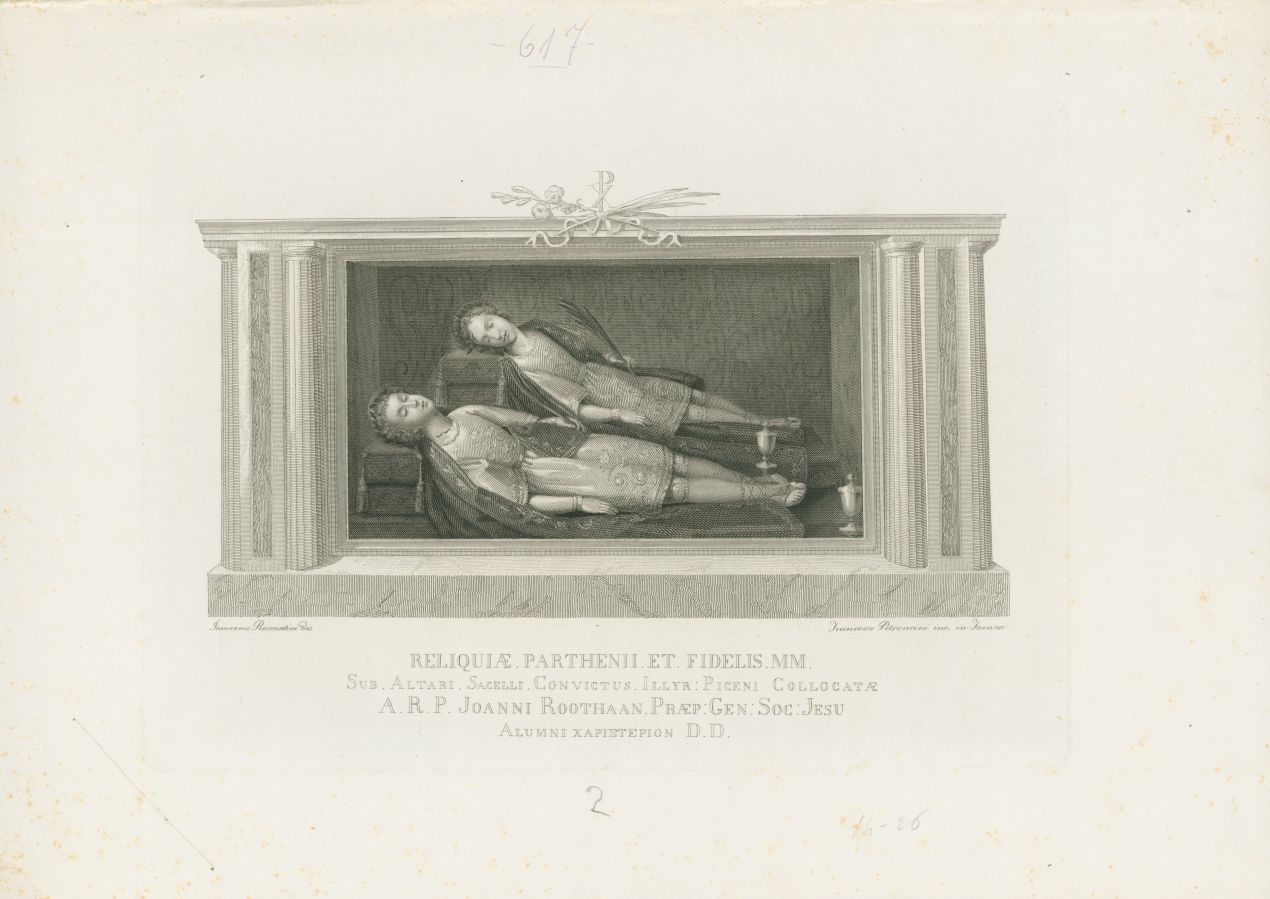 - NOTIZIE STORICO CRITICHE L’acquaforte, disegnata da Innocenzo Recanatini e incisa da Francesco Petroncini, raffigura, come definito nell'iscrizione in calce, le reliquie di due santi martiri. La formula "Parthenii et Fidelis" appare tuttavia di complessa interpretazione: più che due santi distinti, sembra più plausibile che si riferisca a un martire principale, Partenio, e al suo "fidelis", cioè il compagno o discepolo, da identificarsi in san Calogero. Tale interpretazione trova riscontro nella tradizione agiografica dei due santi, venerati insieme il 19 maggio, e le cui reliquie furono traslate nella Cattedrale di Matera nel XVII secolo per volontà del cardinale Giovanni Domenico Spinola. La menzione, nell'iscrizione, della collocazione delle reliquie "sub altari sacelli convictus Illyr Piceni" risulta pertanto difficile da conciliare con la situazione storica, poiché i corpi dei santi Partenio e Calogero erano già stati traslati e stabilmente collocati a Matera, e mai rimossi. È dunque improbabile che l’acquaforte intenda documentare la reale collocazione delle reliquie, quanto piuttosto una rappresentazione di carattere devozionale, concepita per esprimere la venerazione dei due giovani martiri nel contesto gesuitico. La dedica a Joannes Philippe Roothaan, identificato nell'iscrizione in qualità di Preposito Generale della Compagnia di Gesù, carica che ricoprì dal 1829 al 1853, permette di collocare la produzione della stampa entro questi anni, in un contesto gesuitico marchigiano-romagnolo, coerente con le origini degli autori