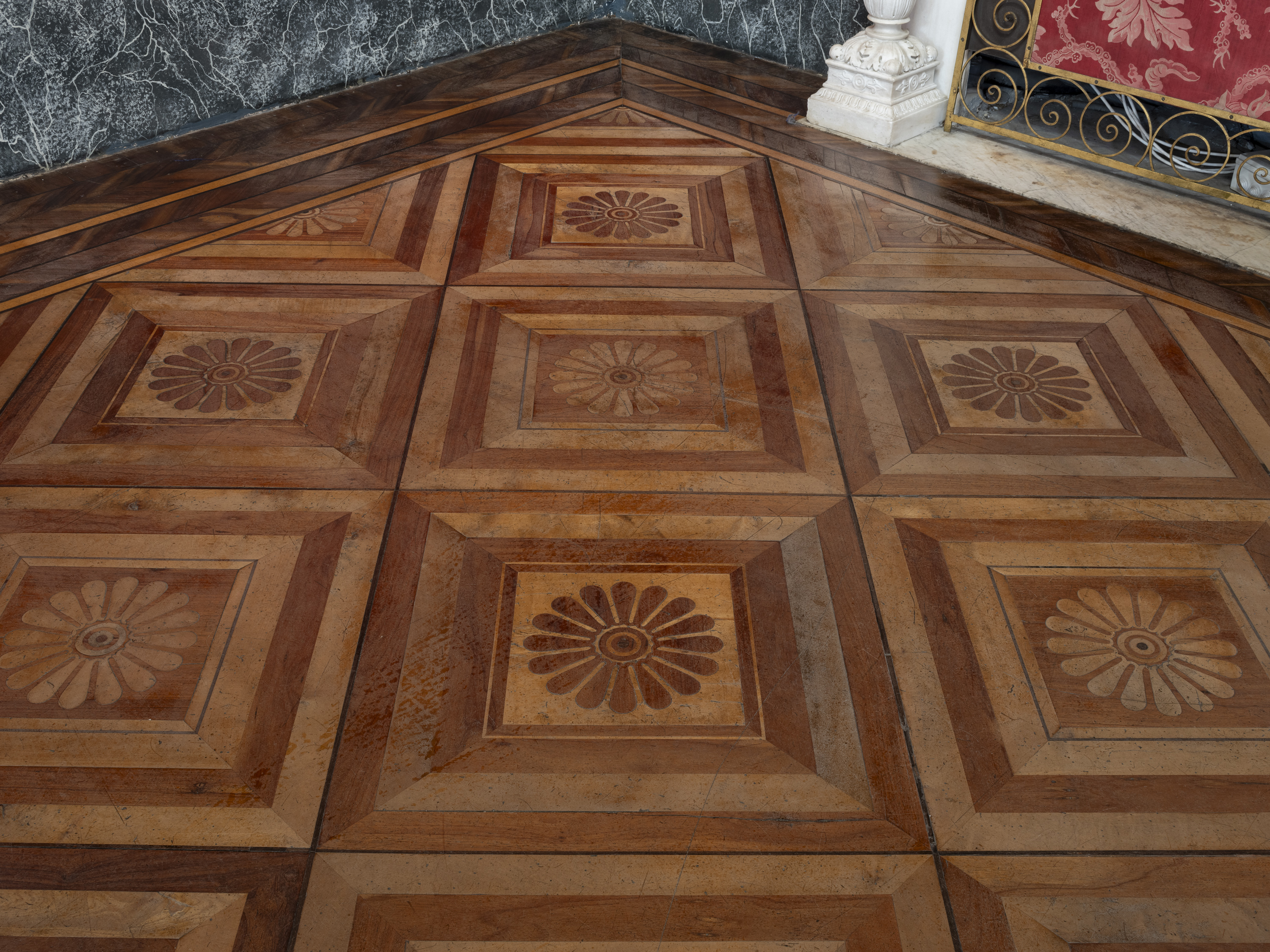 Il pavimento in legni intarsiati presenta uno schema che prevede due cornici perimetrali in legno marrone scuro e al centro un rettangolo diviso in trenta quadrati. Ciascun quadrato è diviso al suo interno da tre cornici che risparmiano al centro un modulo con fiore di sedici petali. L’autore del disegno, Giacomo Varese, decise l’alternarsi di quadrati con fiore chiaro su fondo scuro e relativo alternarsi di contorni e campi occupati da un fiore scuro su fondo chiaro e cornici in accordo. Lo schema è lo stesso nel pavimento della Sala della Udienze e in quello della Camera da letto del Re