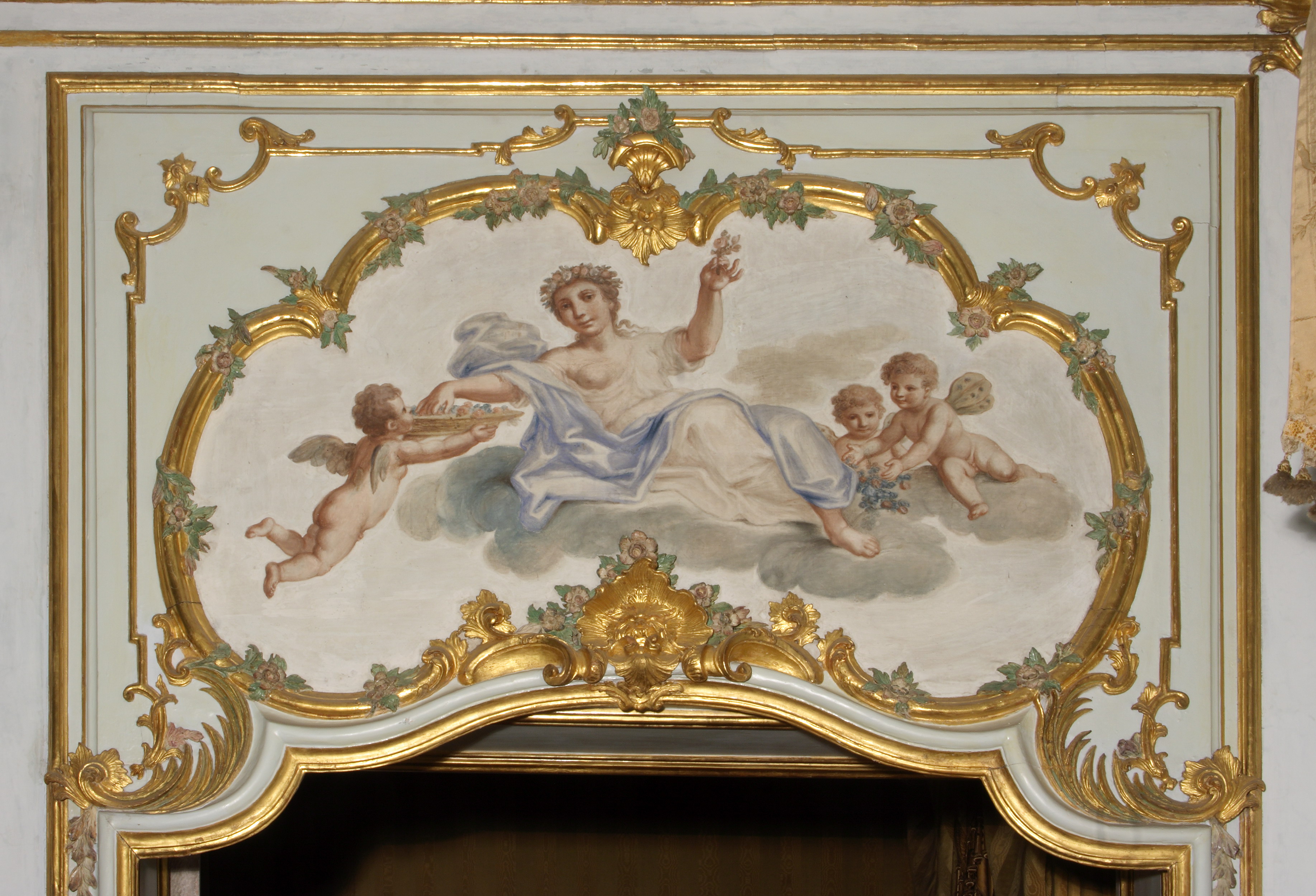Sembra plausibile interpretare i soggetti delle tre sovrapporte come parte di una celebrazione nuziale, in cui Apollo assume il ruolo positivo di protettore della poesia, della musica e della virtù. Se ne può dunque considerare una lettura unitaria come un omaggio al matrimonio di un componente della famiglia, con l'ipotesi che il protagonista del sovrapporta ovest sia Zefiro, sposo di Flora, personaggio già raffigurato da Jacopo Antonio Boni nella volta del Salotto di Aurora. Inoltre, anche gli stucchi, che riprendono il tema floreale e lo combinano con quello degli uccelli, spesso rappresentati in coppia e in atteggiamenti amorosi, sembrano costituire un evidente riferimento al tema nuziale. La scena dipinta a nord ritrae Apollo mentre suona la lira, con una luce brillante che si irradia alle sue spalle, evocando la sua connessione con il sole. Le Muse lo accompagnano, suonando strumenti come il liuto, il flauto, il tamburello e la viola. A est, Flora è distesa al centro della composizione, circondata da tre amorini che spargono fiori su tutta la scena pittorica, i quali appaiono anche nelle incorniciature lignee del sovrapporta e si estendono sulla decorazione plastica del salottino. Specularmente, a ovest, Zefiro domina la scena della sovrapporta, insieme a due putti che gli offrono un festone di fiori, mentre un terzo amorino, con ali di farfalla, lo osserva da dietro