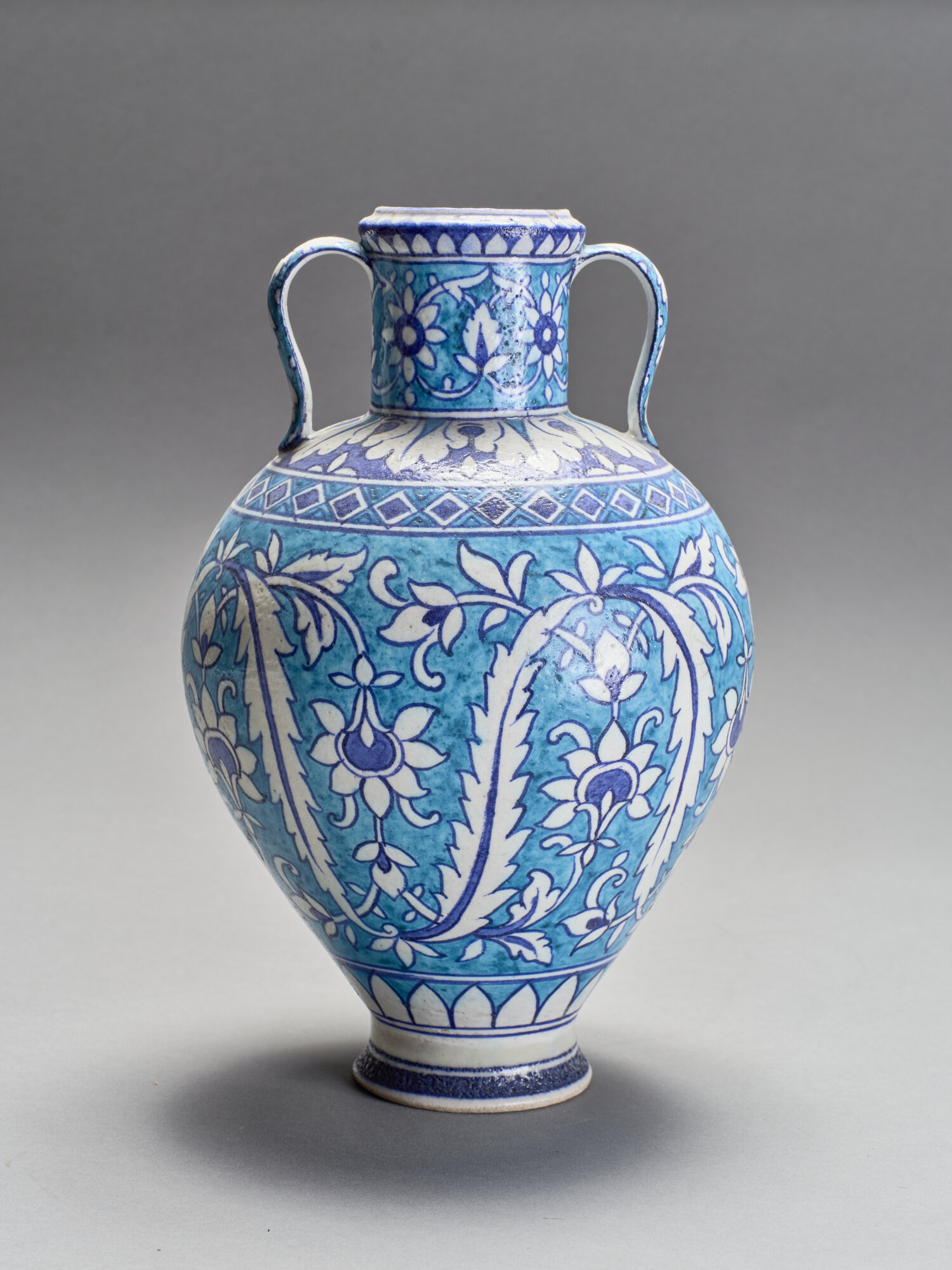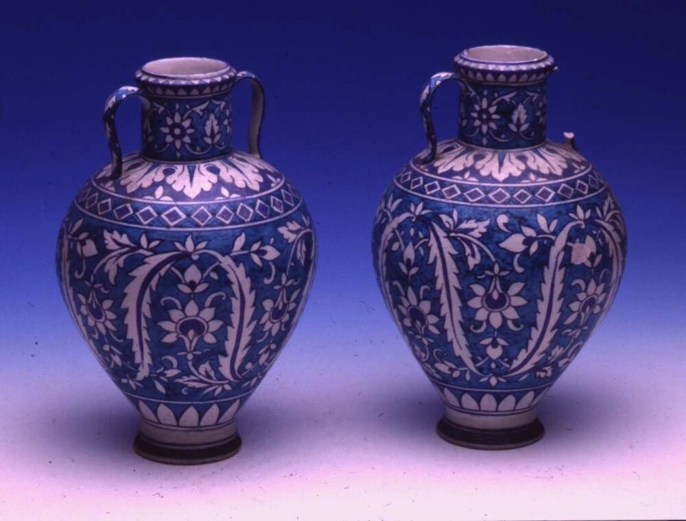 - NOTIZIE STORICO CRITICHE I due vasi sono un tipico prodotto dell’orientalismo ottocentesco. I motivi decorativi e la cromia sono frutto di una libera rielaborazione di elementi ricorrenti nel repertorio della ceramica prodotta nel XVI secolo dalle celebri manifatture turche di Iznik, di cui però non vengono ripresi fedelmente gli schemi. Sono infatti accostati liberamente motivi adottati in epoche diverse. Le grandi foglie ondulate alludono alle foglie dello stile saz, che si affermano nelle arti decorative turche intorno al quarto decennio del Cinquecento per poi godere di una lunga fortuna, mentre l’uso del bianco-blu e del turchese e alcuni elementi floreali sembrano riecheggiare motivi dei primi anni del secolo