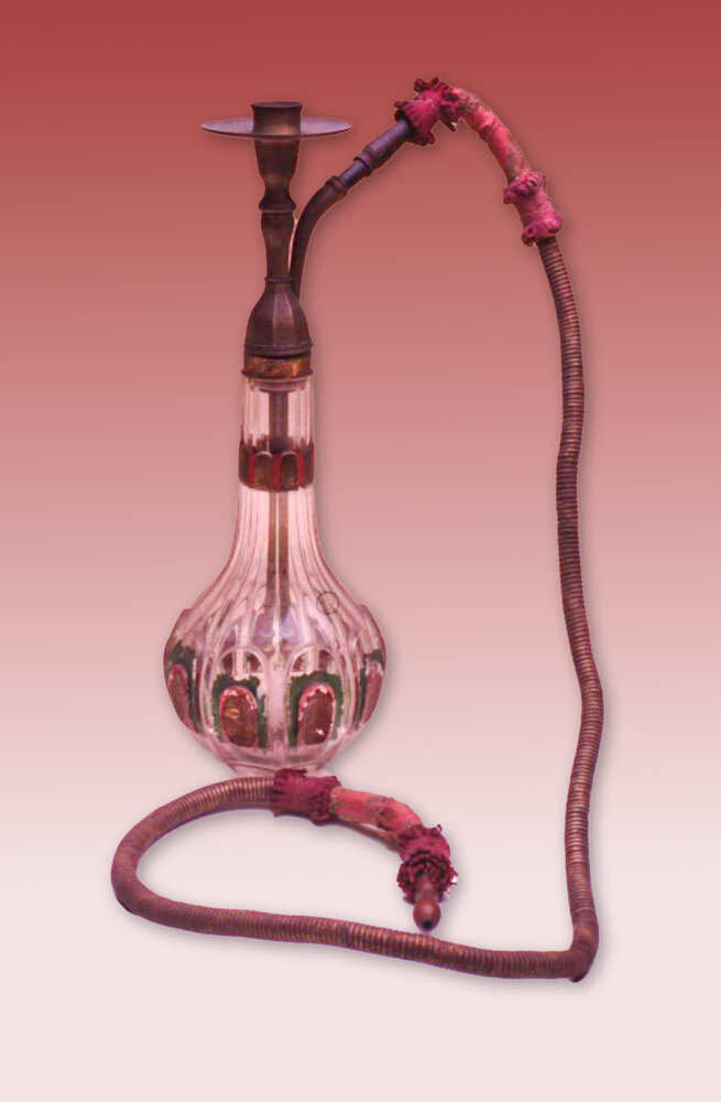 - NOTIZIE STORICO CRITICHE L’oggetto, destinato forse a un pubblico non elitario, come testimoniano i materiali usati per il fornello e il bocchino, si ricollega alla produzione di area ottomana, anche se probabilmente il recipiente in vetro proviene da una manifattura europea ed è stato poi assemblato alle altre parti nell’ambito di una bottega turca. Analogie con un narghilè ottomano con la parte in vetro di produzione boema, comparso recentemente sul mercato antiquario (Oriental Art Auctions 2024)