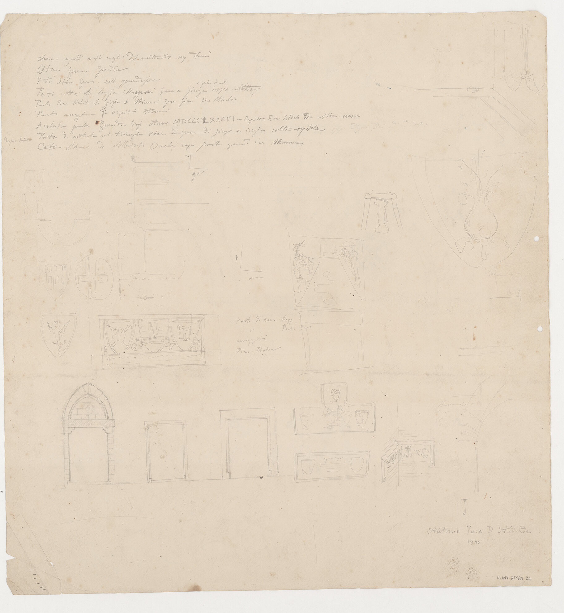 Sul recto sono disegnate in scala 1:25 il prospetto e la sezione del portale di ingresso nel vano triangolare, con la prima campata dell'adiacente porticato. Sul verso ci sono schizzi di porte, targhe e stemmi con indicazioni e annotazioni. Il foglio è firmato su ambo i lati con due nomi diversi