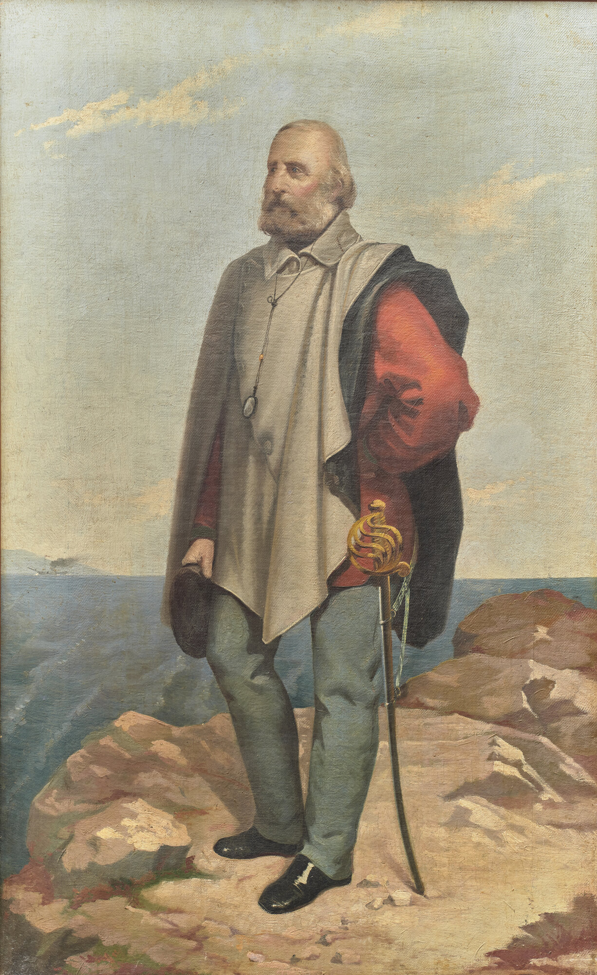 Ritratto a figura intera di Giuseppe Garibaldi in piedi sul bordo di una scogliera