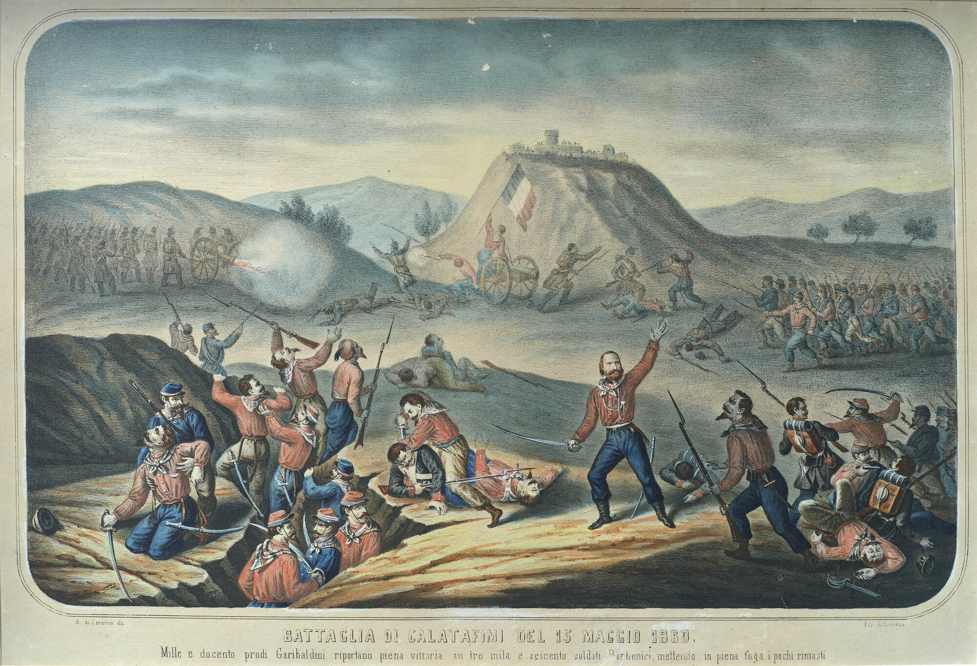 Battaglia di Calatafimi del 15 maggio 1860. Mille e duecento prodi Garibaldini riportano piana vittoria su tre mila e seicento soldati Borbonici, mettendo in piena fuga i pochi rimasti. Battaglia di Calatafimi