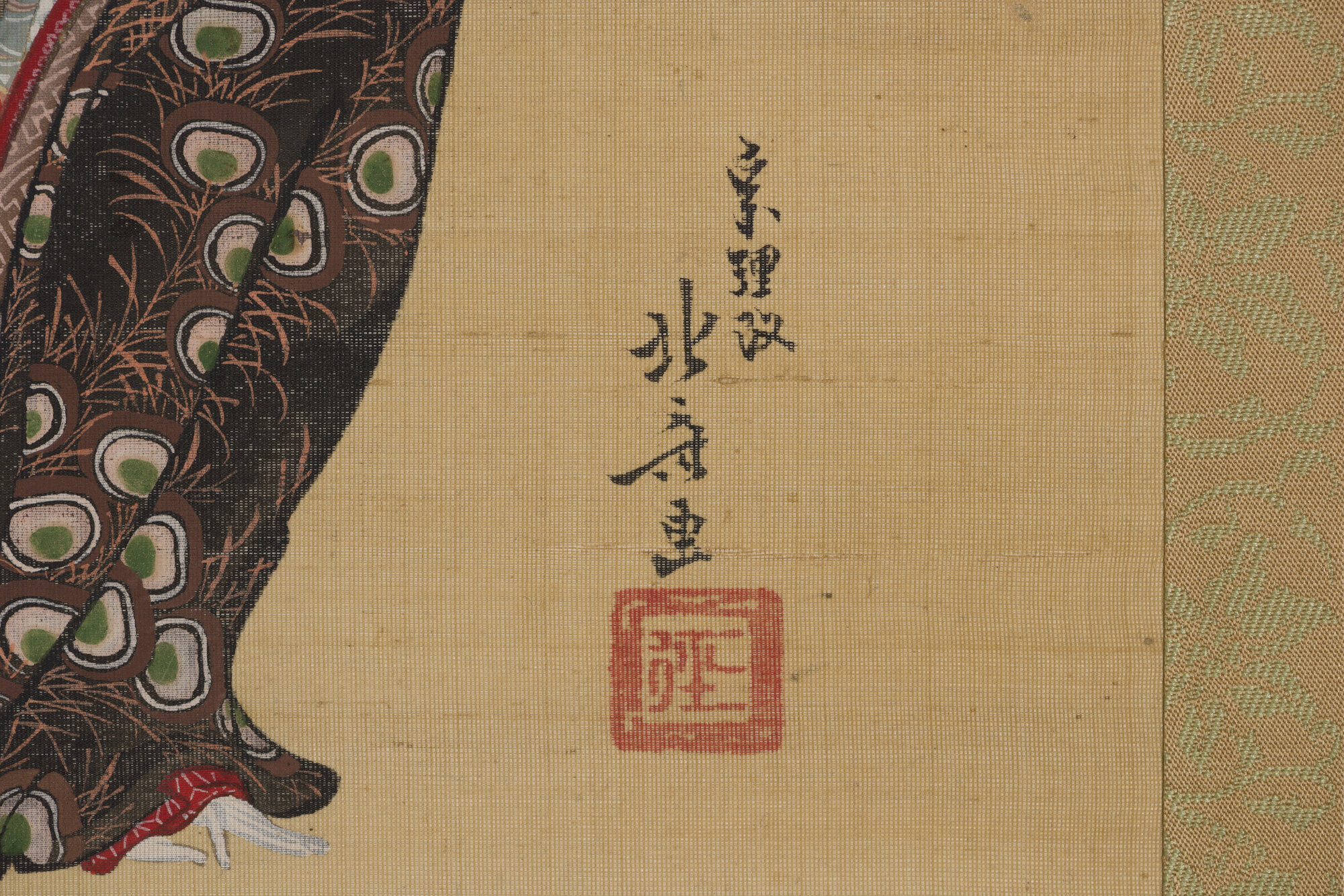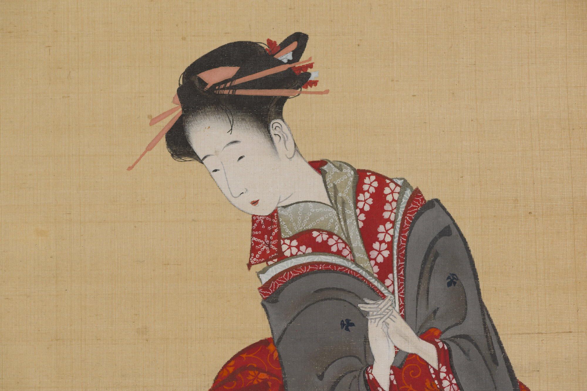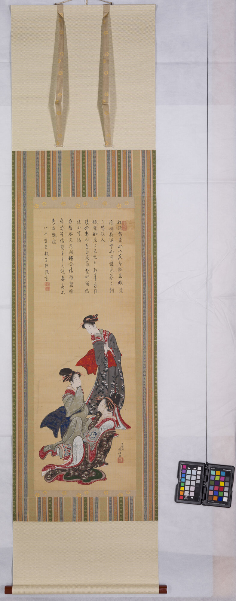 Dipinto con montatura nuova Yamato hyōgu in seta: Ichimonji e fūtai in kinran a fondo avorio con minuto motivo geometrico e fiori di susino sparsi; chūberi in tessuto operato a righe verticali multicolori decorate; jōge color avorio; jikushu in legno e lacca bruno-rossiccia. I tre terzi inferiori del campo figurato sono occupati da tre figure femminili, sovrastate da tre composizioni poetiche in cinese. La disposizione dei personaggi, inscrivibile in un triangolo scaleno, sembra alludere ai tre elementi principali di una composizione floreale seika. La cortigiana in primo piano, pettinata con un alto chignon doppio yoko-hyōgo, siede appoggiandosi al braccio sinistro teso, con le ginocchia flesse e il busto sospinto all'indietro, morbidamente avvolta in vesti lussuose: il soprabito di seta nera, un poco scivolato sulle spalle, è decorato con un fitto disegno a piume di pavone e si raccoglie alla base della figura formando una ricca falda ondata e tondeggiante. Dietro di lei siede una donna di città maritata, riconoscibile dall'acconciatura in stile marumage, in abito grigio chiaro con un rameggio di trifoglio selvatico. La terza figura femminile, appartenente alla classe mercantile, è in piedi, indossa un kimono grigio scuro adorno di convolvoli azzurri ed è pettinata nello stile shimadamage